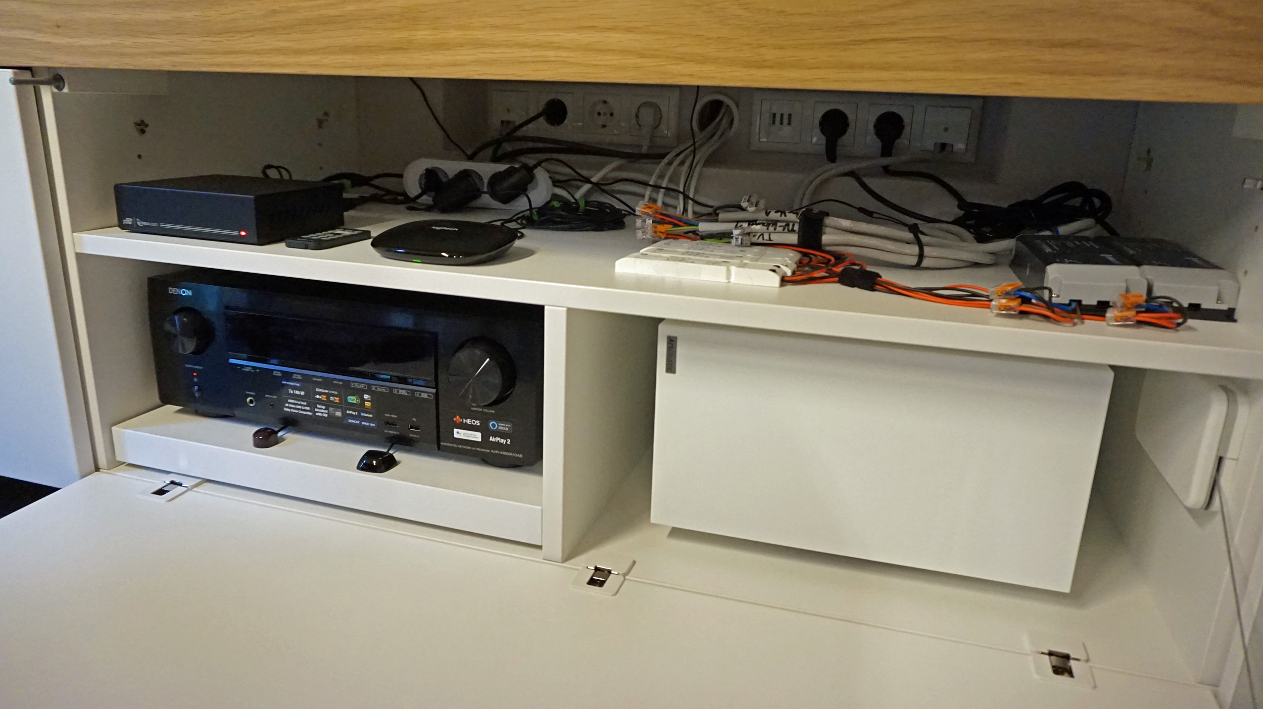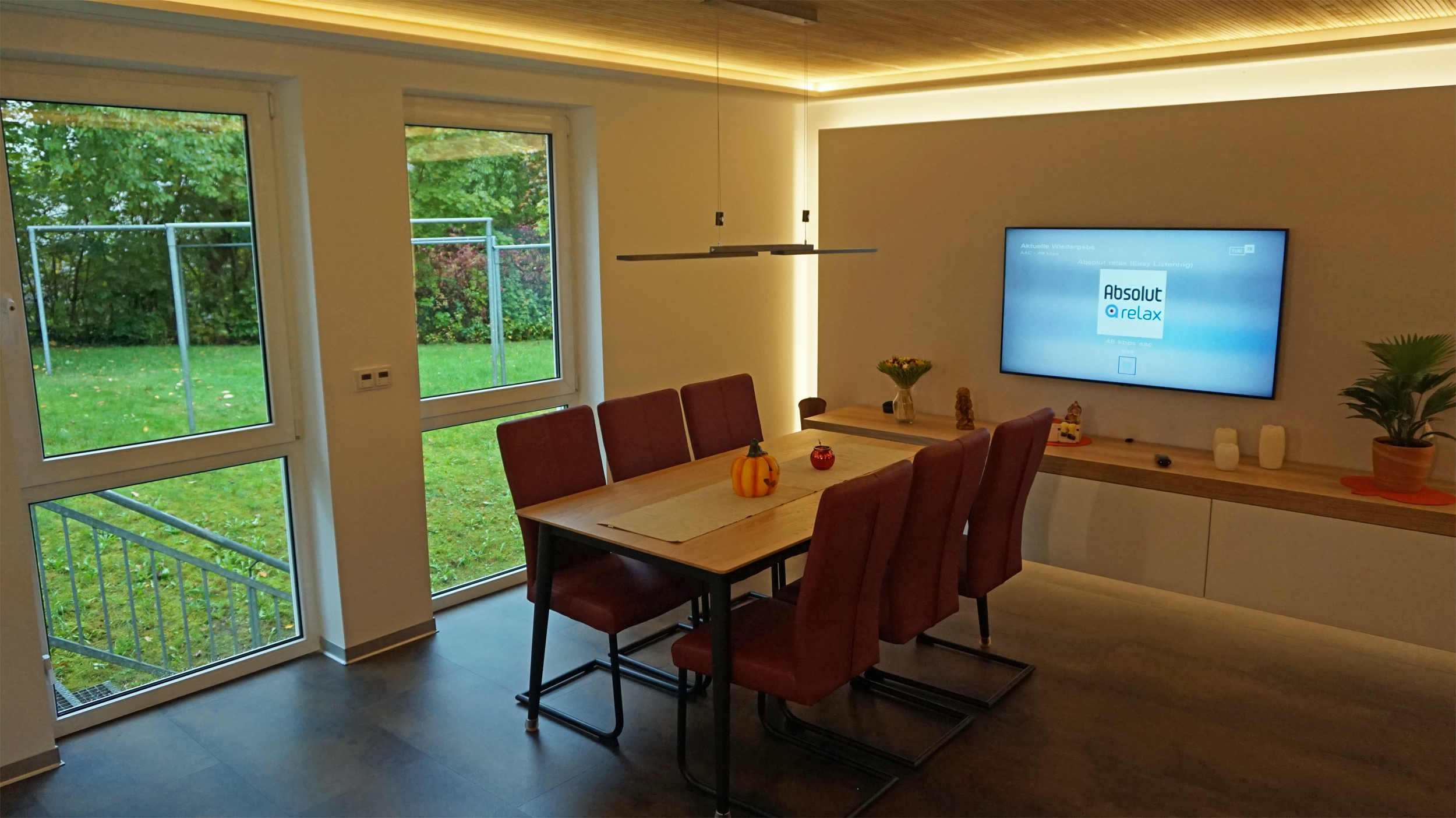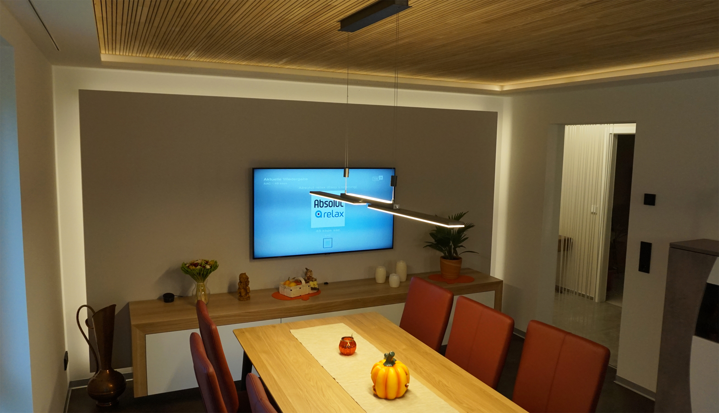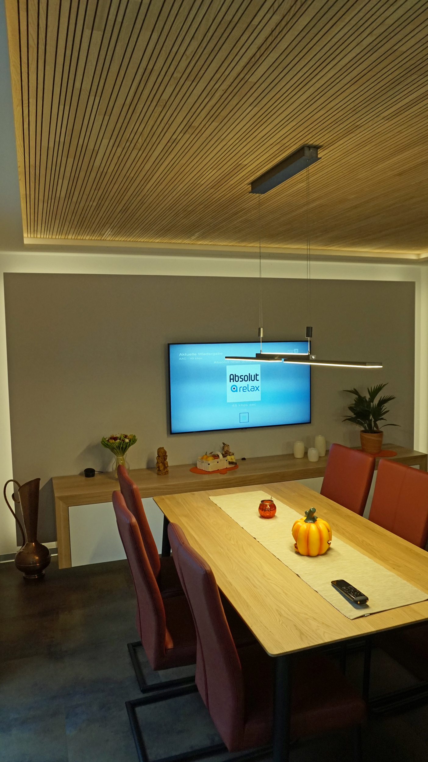 In die seitlichen Trockenbau-Vouten wurden dimmbare LED-Bänder montiert. Tollen Surround-Klang liefern unsichtbar verbaute Lautsprecher im hinterleuchteten Wandsegel (3 Stück) und der Lichtvoute (2 Stück). Im Sideboard ist Platz für den Subwoofer von Artcoustic. Dort ist auch die Technik verstaut. Alles bequem steuerbar mit einer zentralen Touch-Fernbedienung.