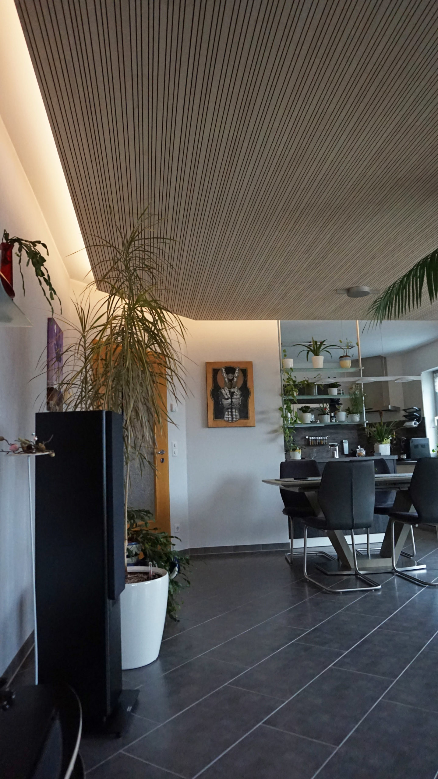 Das haben wir erreicht mit der Holz-Akustikdecke von Ligno. Die so genannte Nachhallzeit konnte etwa halbiert werden und die fein gegliederte Decke bricht den Schall angenehm. Gespräche, Musik und vor allem Filme bei höherer Lautstärke machen nun deutlich mehr Spaß.