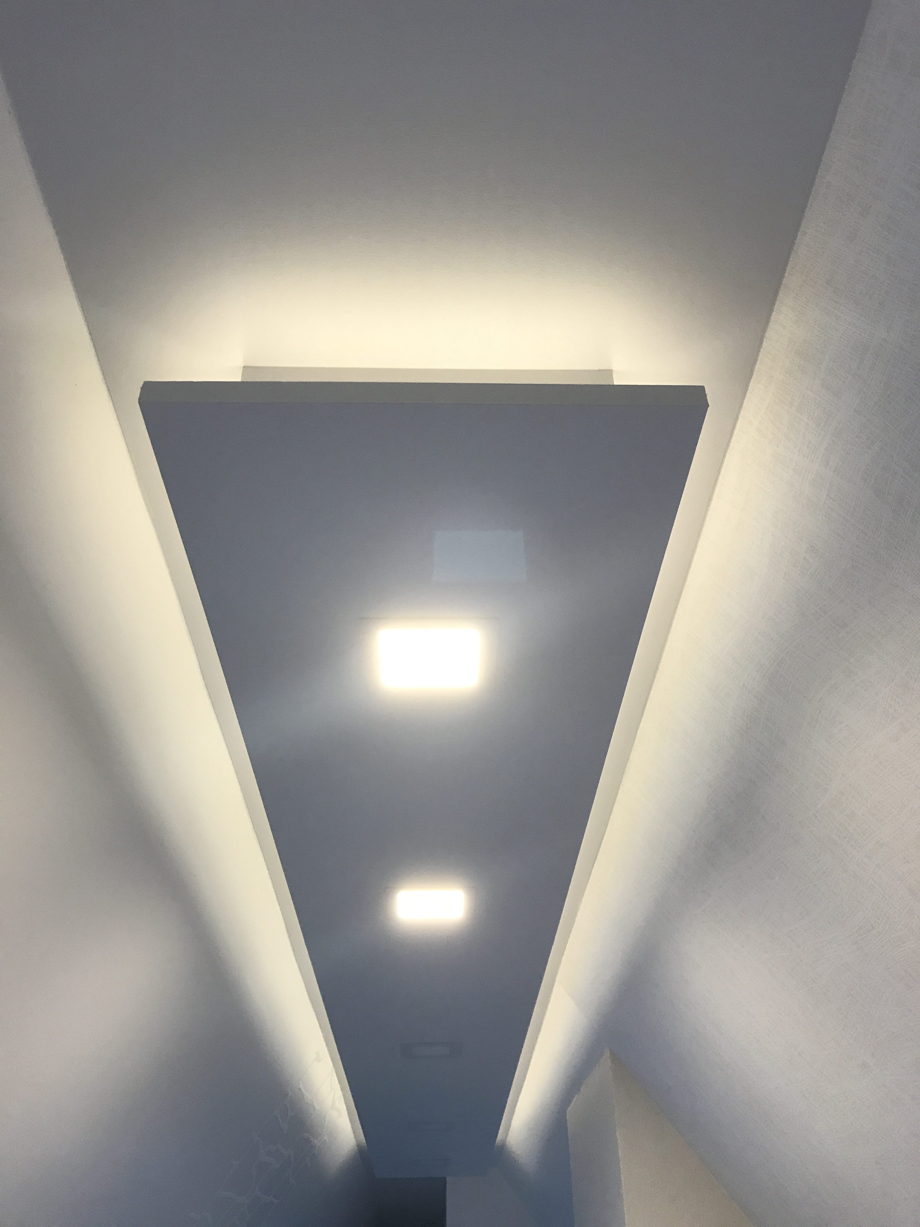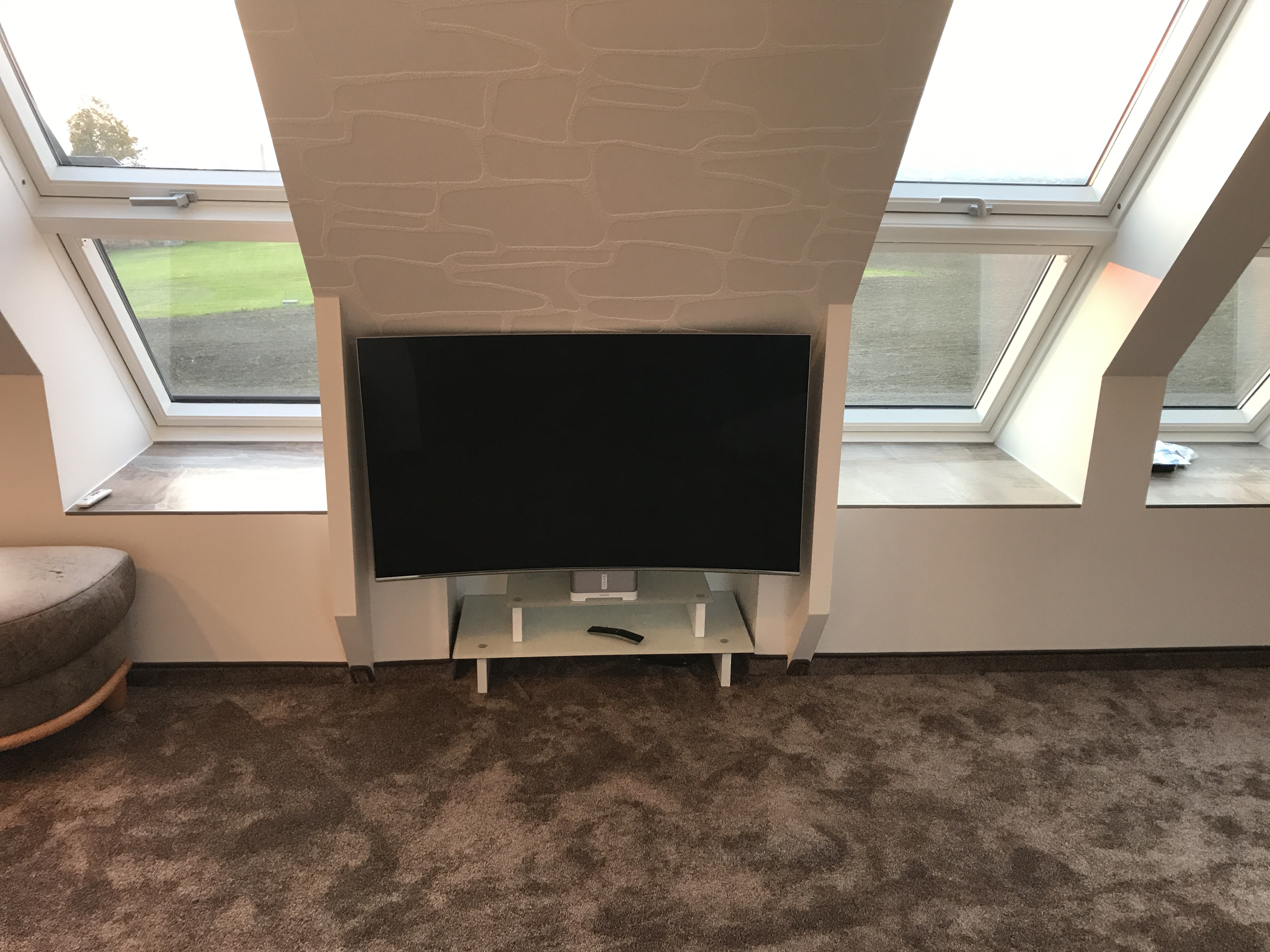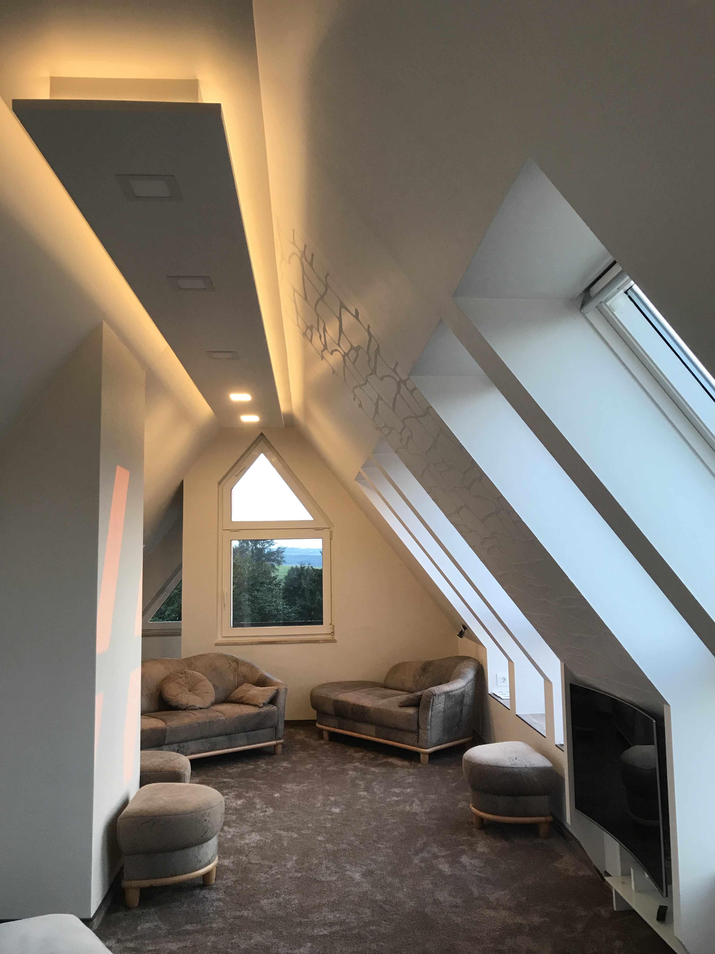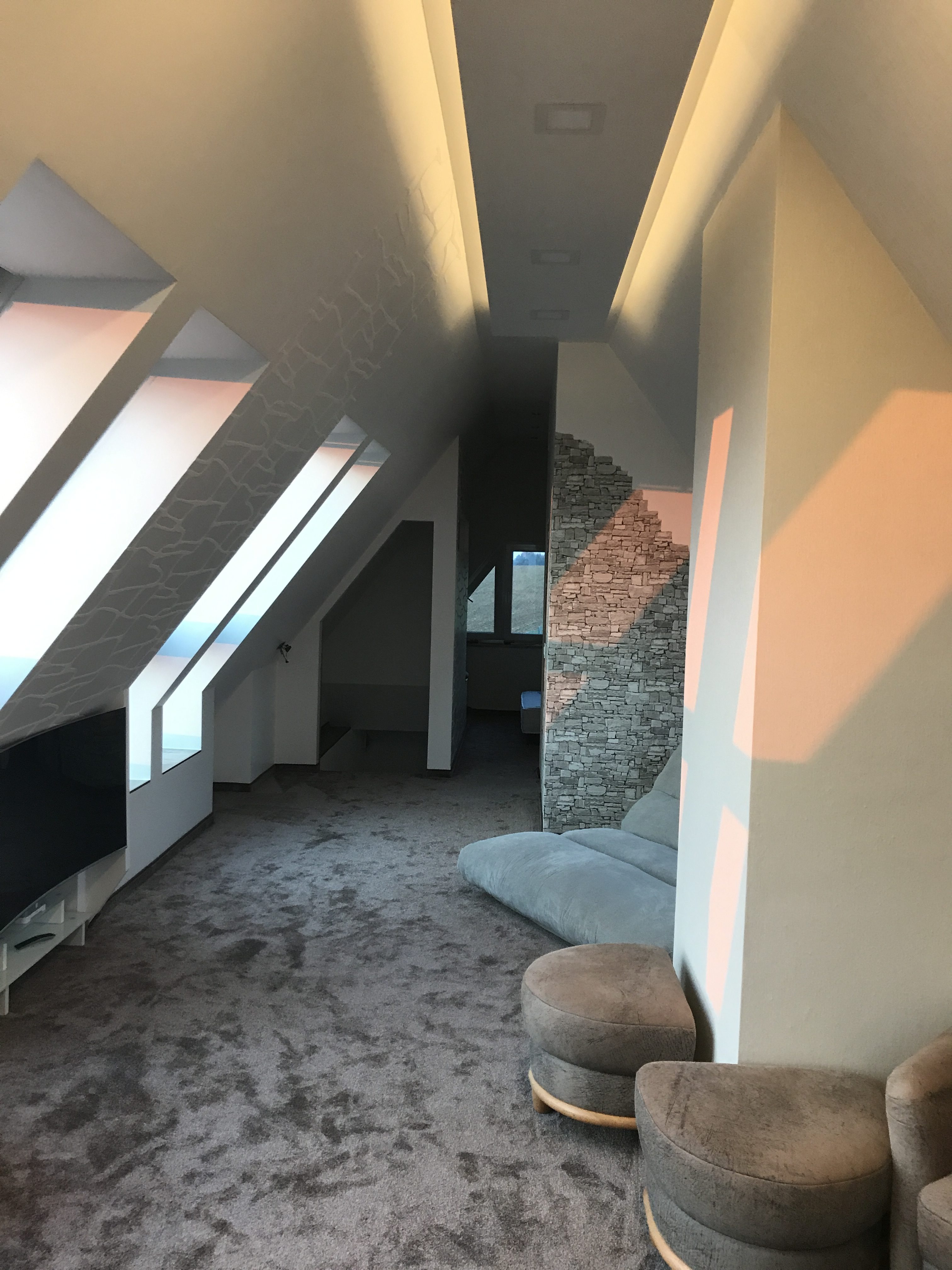 Der Treppenaufgang wurde mit einer Spezialkonstruktion abgetrennt und eine Tür sowie Oberlicht mit Verglasung eingebaut. Im Wohnbereich rundet ein Deckensegel mit integrierter Lichtvoute das Wohnambiente ab. Für den Hörgenuss haben wir in die Dachschräge einen unsichtbaren Singlelautsprecher von Stealth Acoustics fugenlos eingespachtelt. Der Netzwerkstreamer Connect Amp von Sonos gibt dem Flächenlautsprecher die notwendige Energie, um feinste Musikqualität zu genießen.