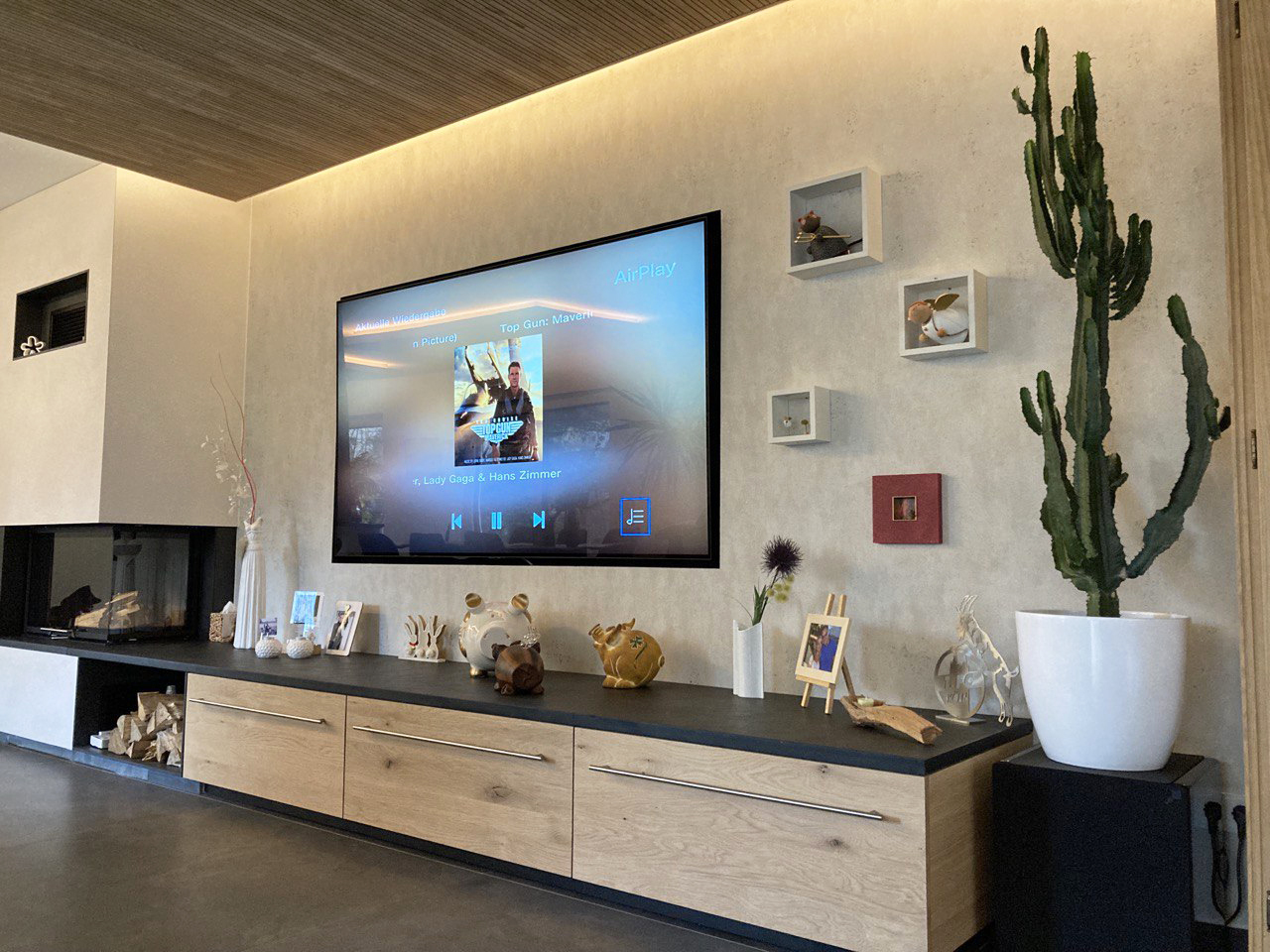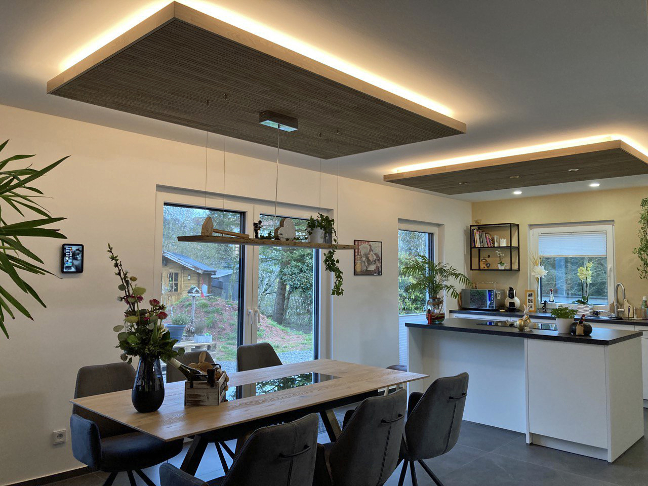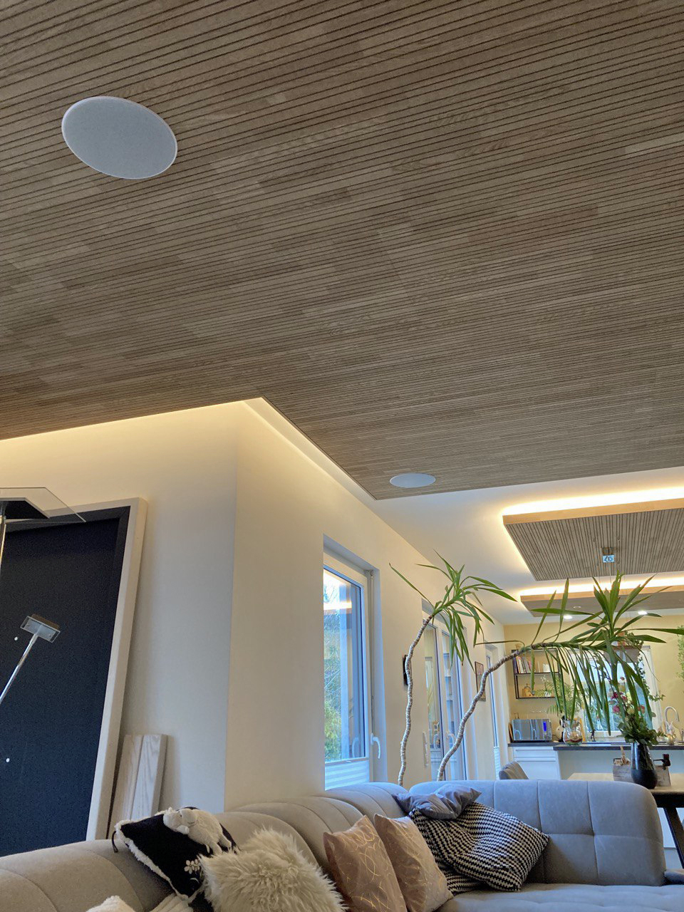 Die Ligno-Akustikdecke ist vollflächig bzw. als Deckensegel gestaltet. Indirektes Außenlicht und Innenlicht an den Schürzen der Decke setzt einzelne Bereiche in Szene und sorgt für eine Grundhelligkeit im Raum. Ergänzt wird mit Design-Leuchten und LED-Spots für direkte Beleuchtung. Im Wohnzimmer sorgen 3 unsichtbar verbaute Lautsprecher in der TV-Wand für präzisen Sound, ein kräftiger Bass für Kinoerlebnis wird per freistehendem 10‘‘ Subwoofer ergänzt. Surround-Lautsprecher sind dezent in der Ligno-Decke über der Couch verbaut. In der Küche liefert ein unsichtbarer Lautsprecher Stereo-Sound im kompletten Frequenzbereich. Der Verstärker und Zubehör findet staubgeschützt im Lowboard Platz. Für schnellen Zugriff auf die Musik-Apps kann das iPad mini aus der induktiven Wand-Ladestation (im Ess-Bereich) genommen werden.