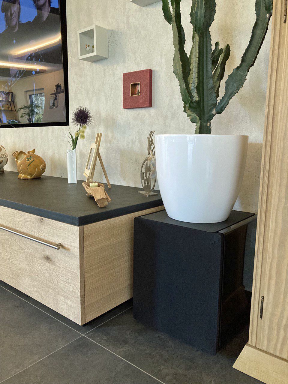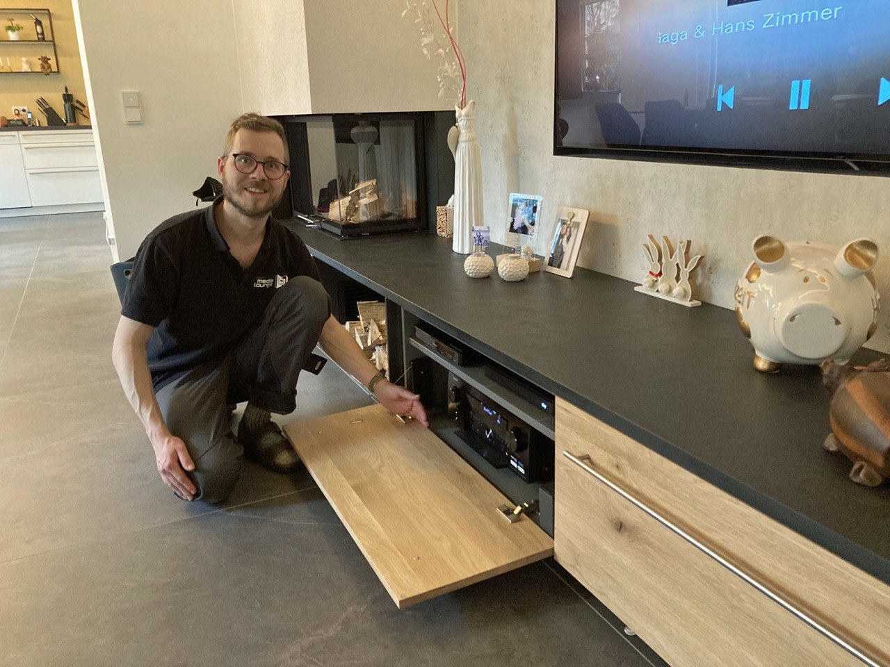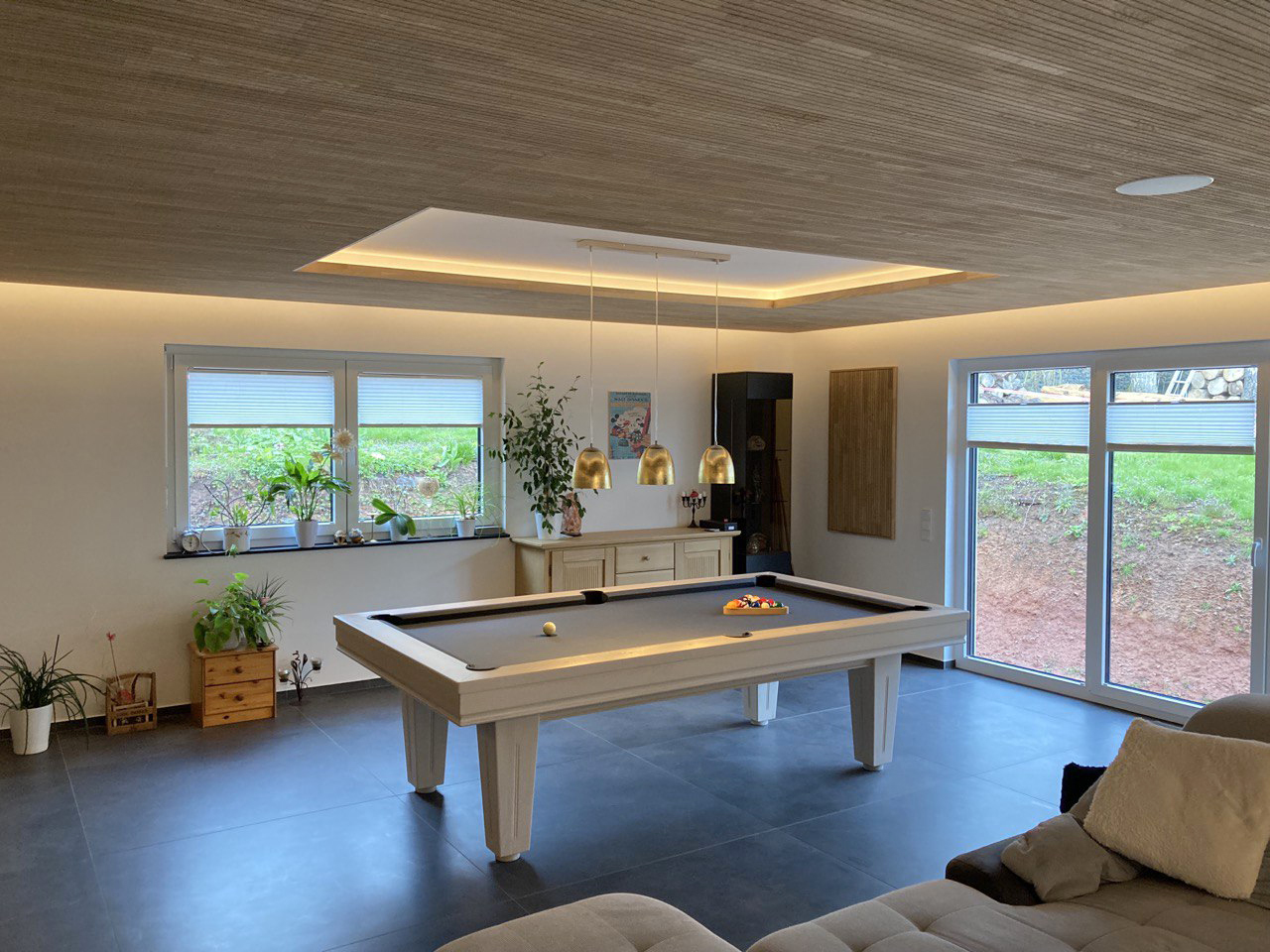 Die Ligno-Akustikdecke ist vollflächig bzw. als Deckensegel gestaltet. Indirektes Außenlicht und Innenlicht an den Schürzen der Decke setzt einzelne Bereiche in Szene und sorgt für eine Grundhelligkeit im Raum. Ergänzt wird mit Design-Leuchten und LED-Spots für direkte Beleuchtung. Im Wohnzimmer sorgen 3 unsichtbar verbaute Lautsprecher in der TV-Wand für präzisen Sound, ein kräftiger Bass für Kinoerlebnis wird per freistehendem 10‘‘ Subwoofer ergänzt. Surround-Lautsprecher sind dezent in der Ligno-Decke über der Couch verbaut. In der Küche liefert ein unsichtbarer Lautsprecher Stereo-Sound im kompletten Frequenzbereich. Der Verstärker und Zubehör findet staubgeschützt im Lowboard Platz. Für schnellen Zugriff auf die Musik-Apps kann das iPad mini aus der induktiven Wand-Ladestation (im Ess-Bereich) genommen werden.