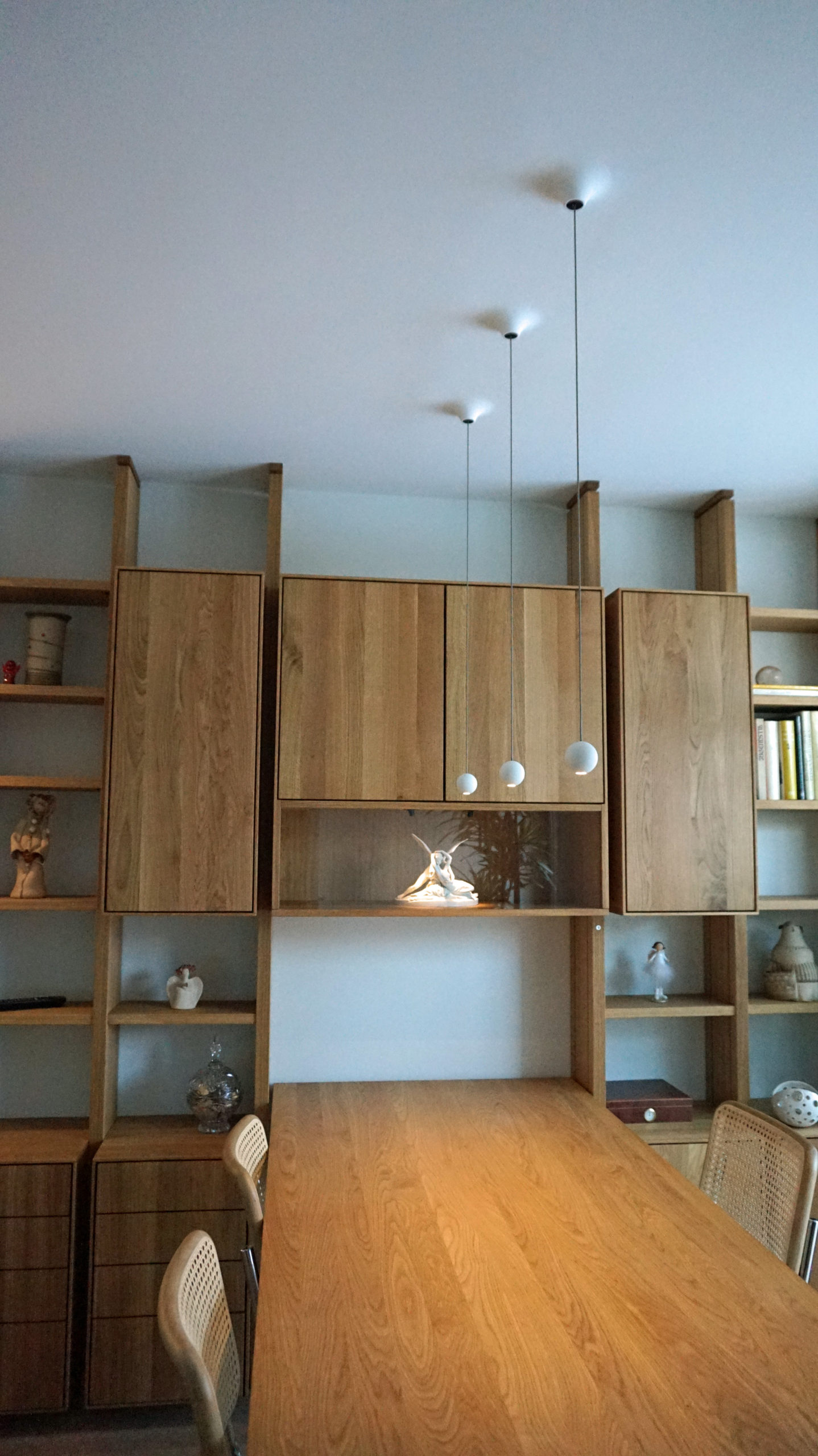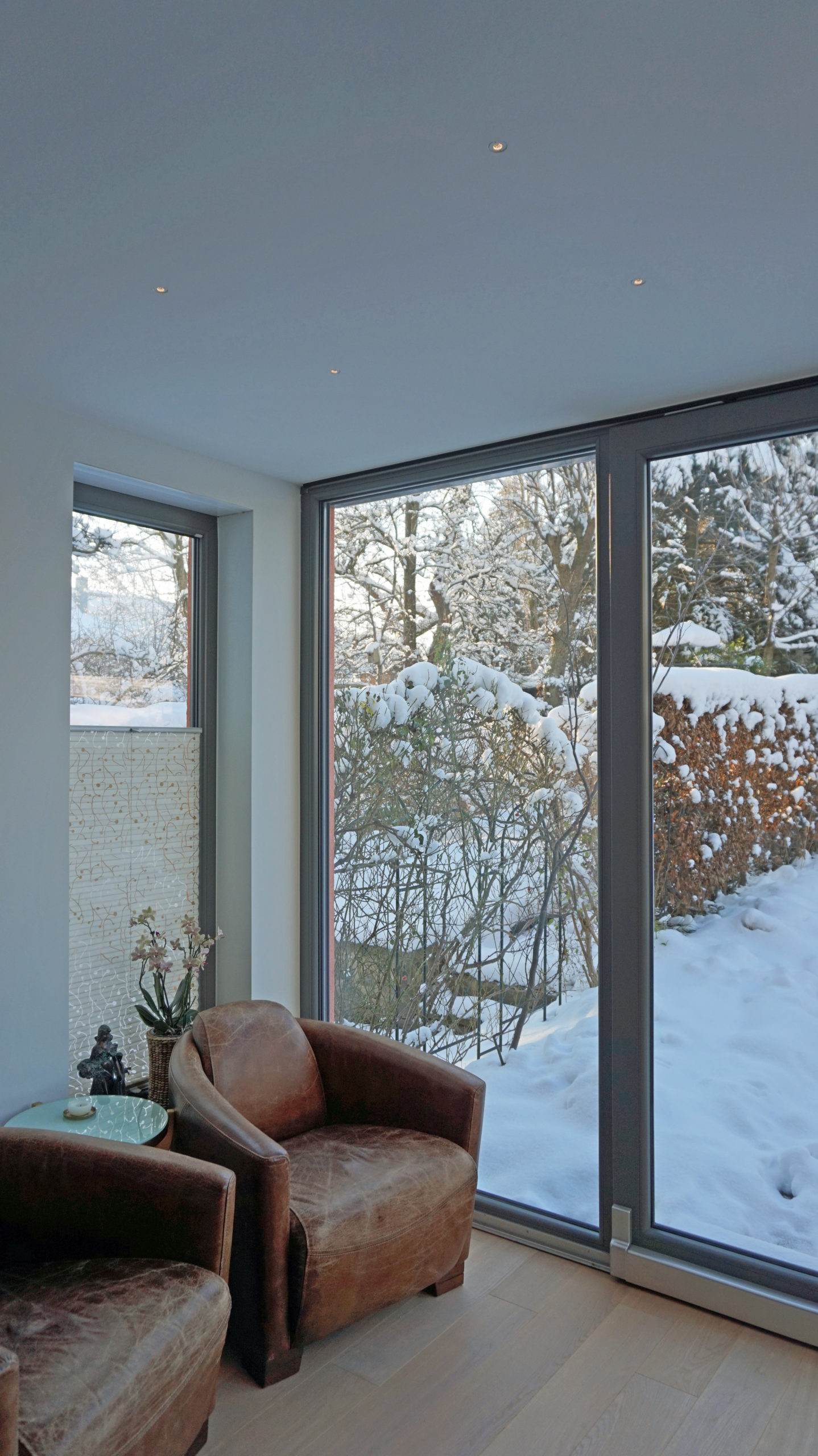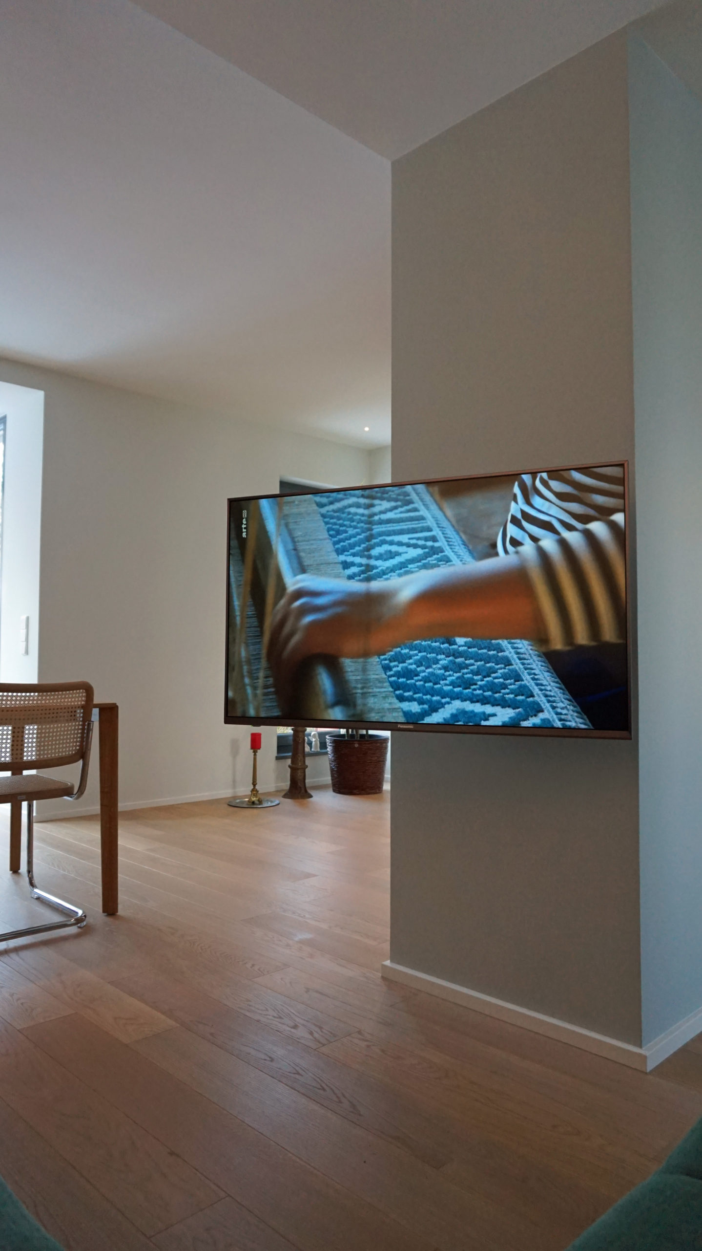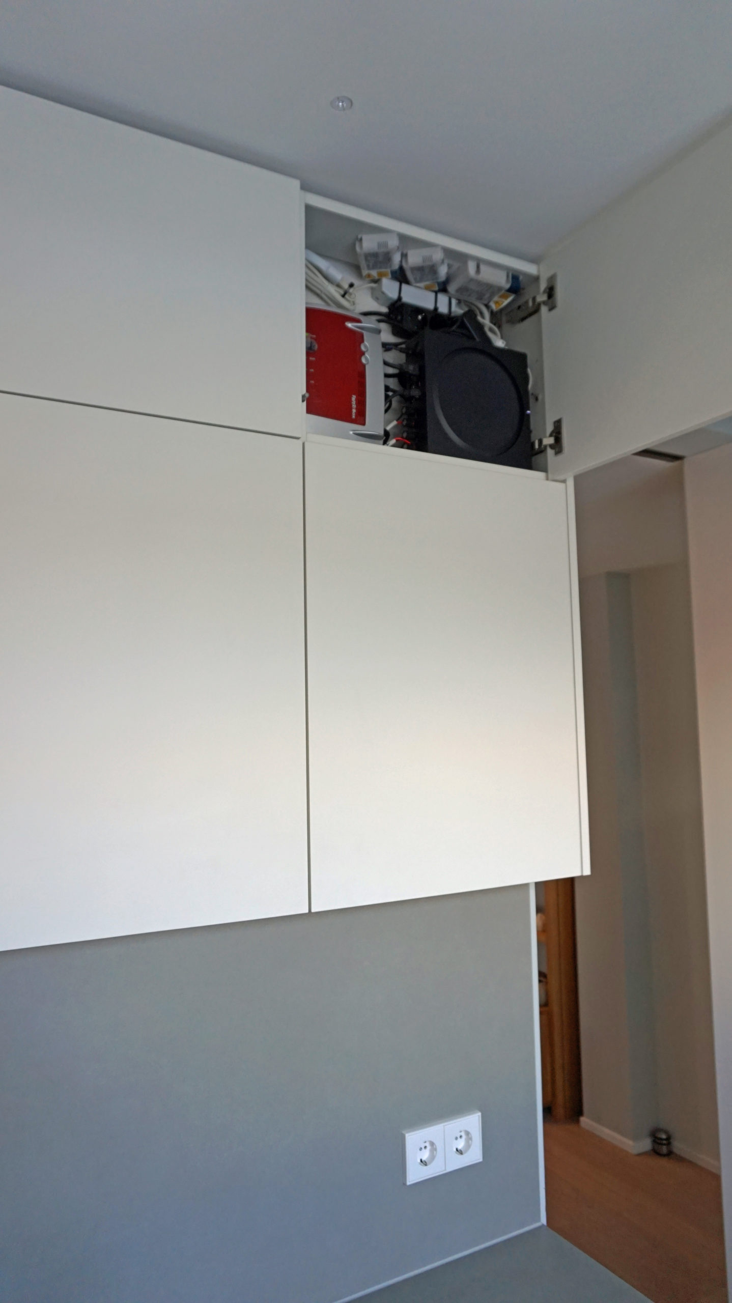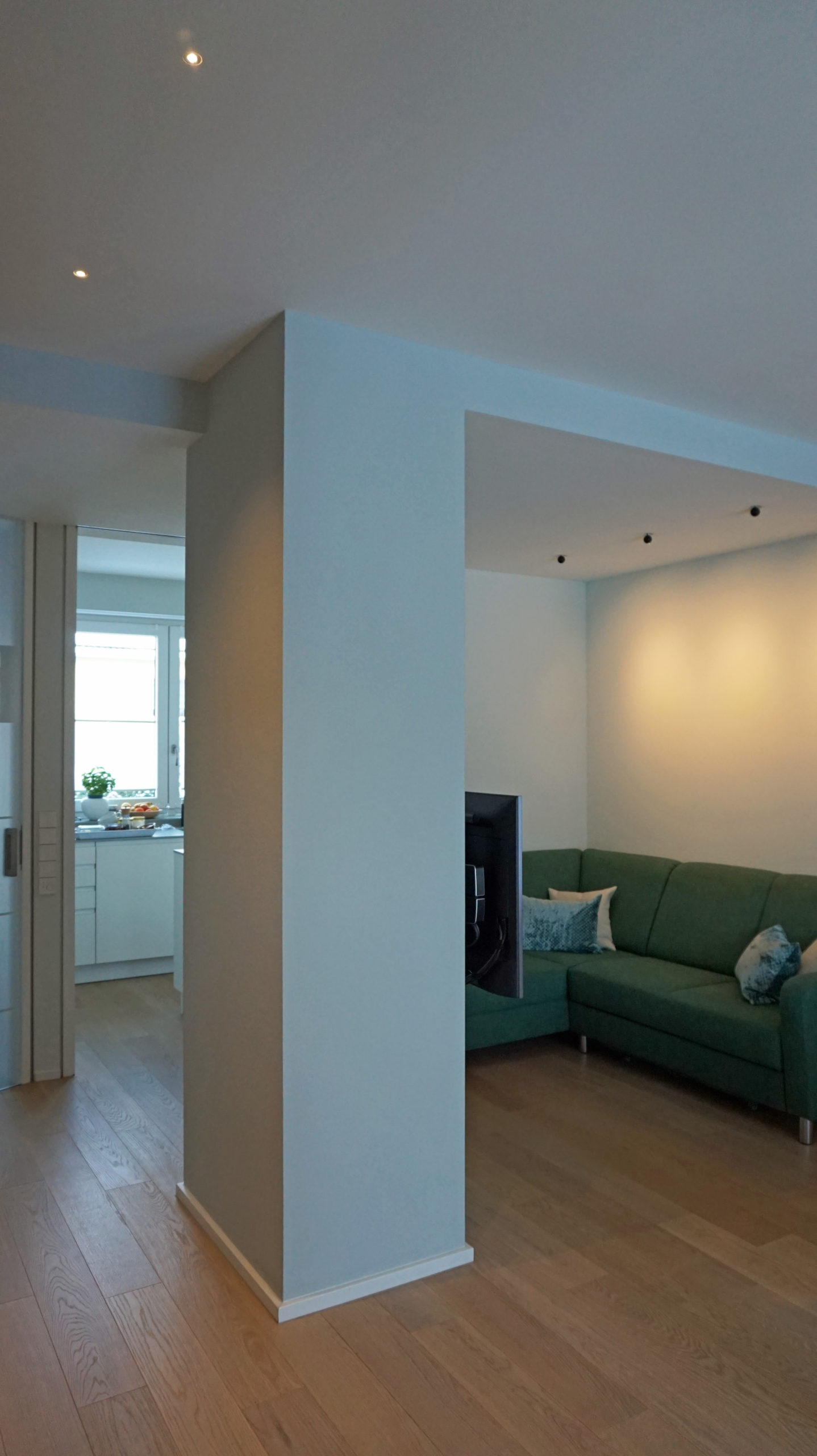 Das Team von Media Lounge Jensch hat mit der Raumgestaltung Trockenbau-Decken, Wandelemente und Stütze hochwertig verkleidet. Moderne Medientechnik sorgt für beste Unterhaltung.Filigran angespachtelte LED-Leuchten und Pendelleuchten von Georg Bechter Licht sind kreative Details. Zwei Flächenlautsprecher, „LR8g“ von Stealth Acoustics, wurden im Wohnzimmer unsichtbar und fugenlos in die Decke integriert. Mit dem Streaming-Verstärker „Amp“ von Sonos, im Zusammenspiel mit dem Panasonic-TV, erreicht das Audiosystem einen qualitativ hochwertigen und kraftvollen Sound im ganzen Raum. Die Unterbringung der Technik ist platzsparend im Küchenschrank revisionierbar untergebracht. Die Technikverkabelung wurde unsichtbar verlegt. TV und schwenkbare Halterung von Vogels wirken schwebend und elegant zu gleich.