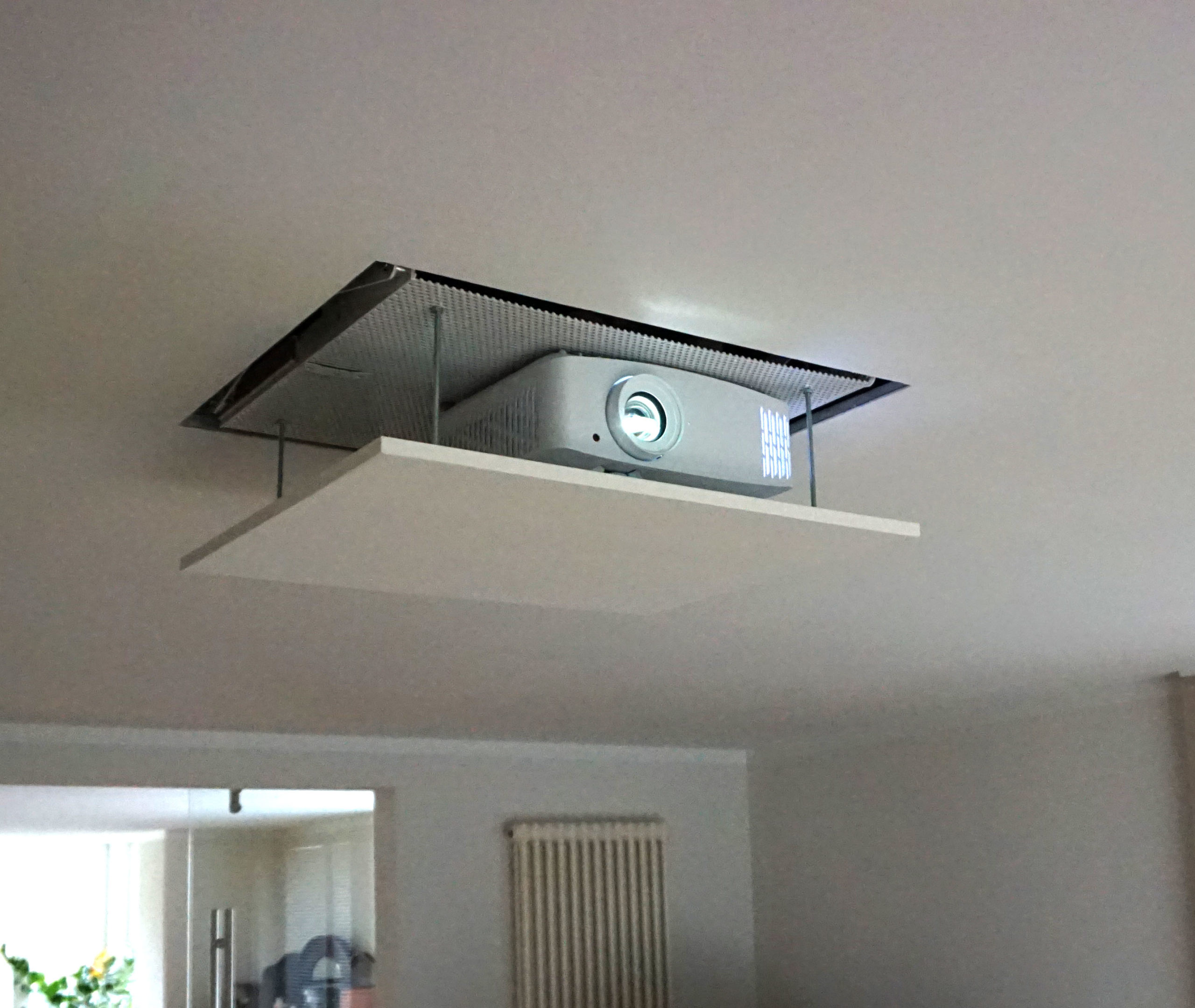 So fahren Projektor und Leinwand motorisiert aus dem Deckenhohlraum nur dann, wenn sie gebraucht werden. Sämtliche Lautsprecher für hohe und mittlere Töne sind komplett unsichtbar in die Trockenbaudecke eingelassen – 3 Stück für Front, 2 für Surround und 2 für Surround Back.