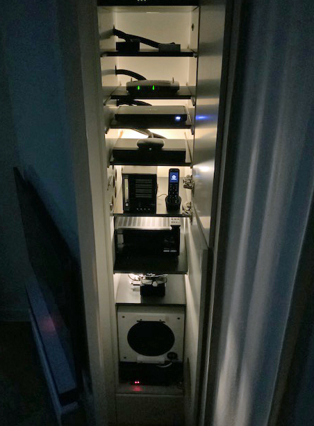 Der Subwoofer findet im Technikschrank Platz. Ebenso AV-Receiver, Audio-Endstufe und Zuspieler.