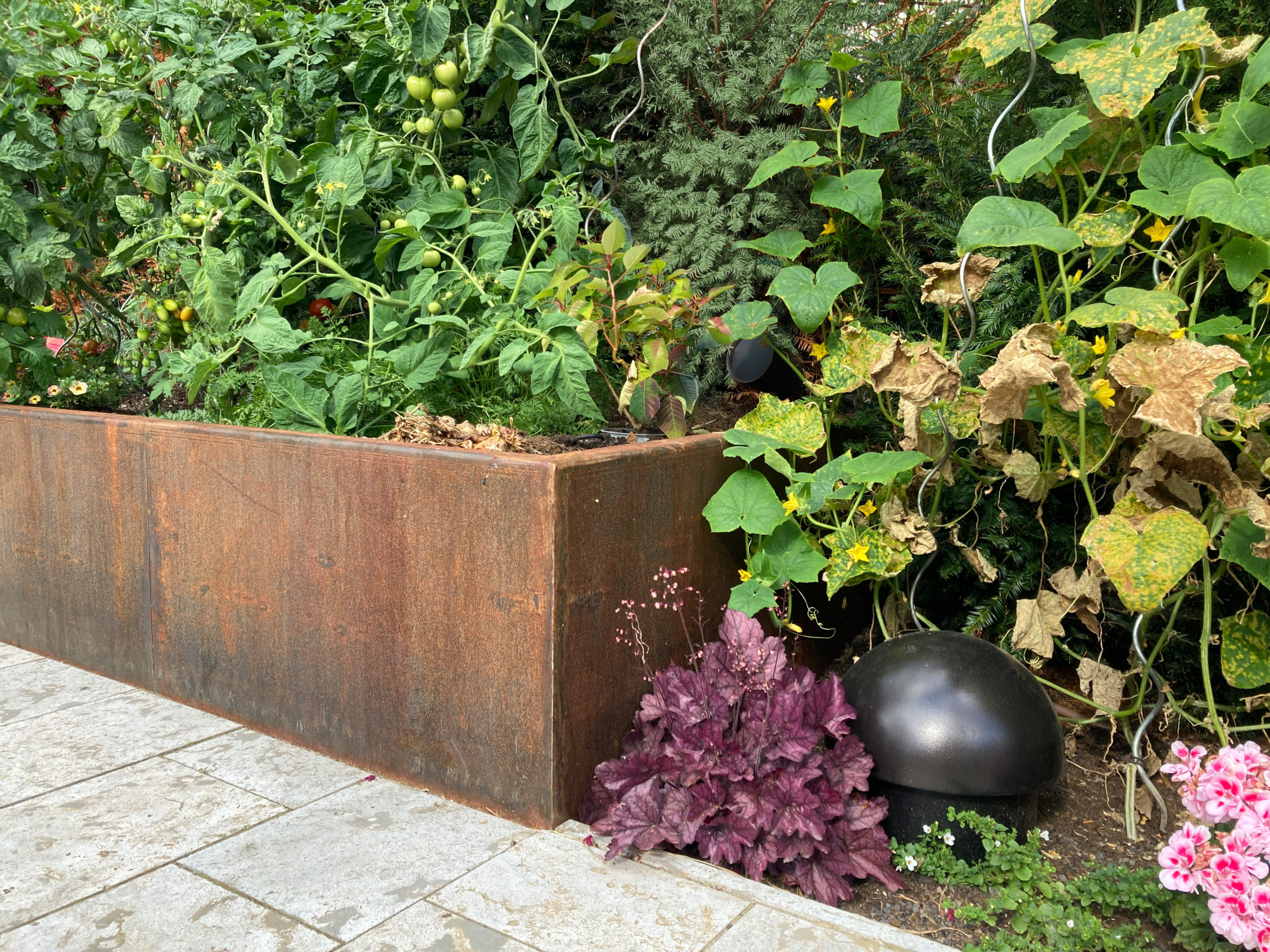 Im Außenbereich haben wir das Patio-System von Sonance in das Pflanzbeet fest verbaut. Das System besteht aus einem zylindrischen Subwoofer, der in die Erde eingelassen ist. Ergänzend für Mittel-/Hochton sind vier Erdspieß-Lautsprecher zwischen den Pflanzen verteilt und beschallen die Terrasse gleichmäßig. Die Musikwiedergabe erfolgt über einen SONOS-Verstärker und dazugehöriger Smartphone-App.