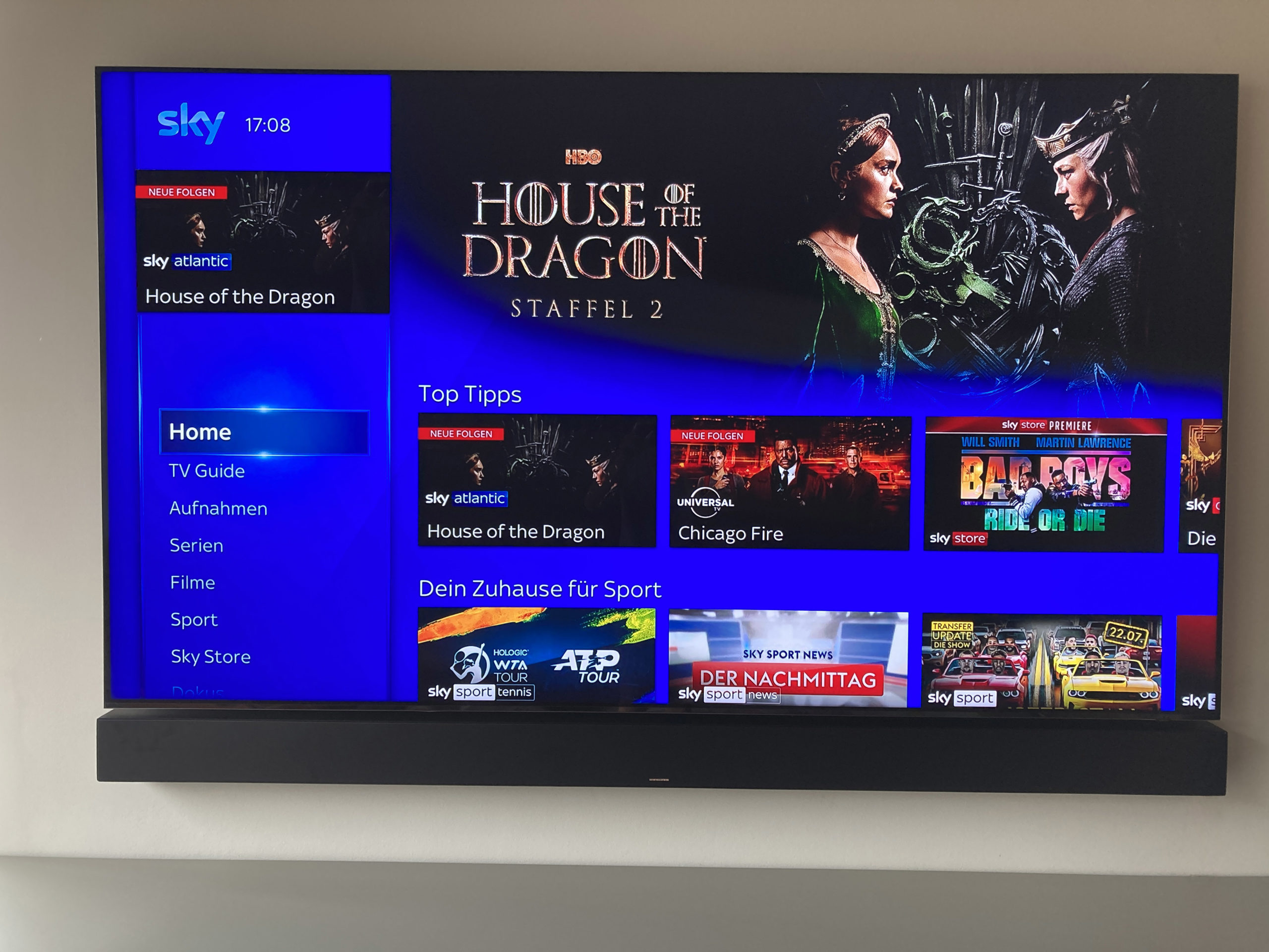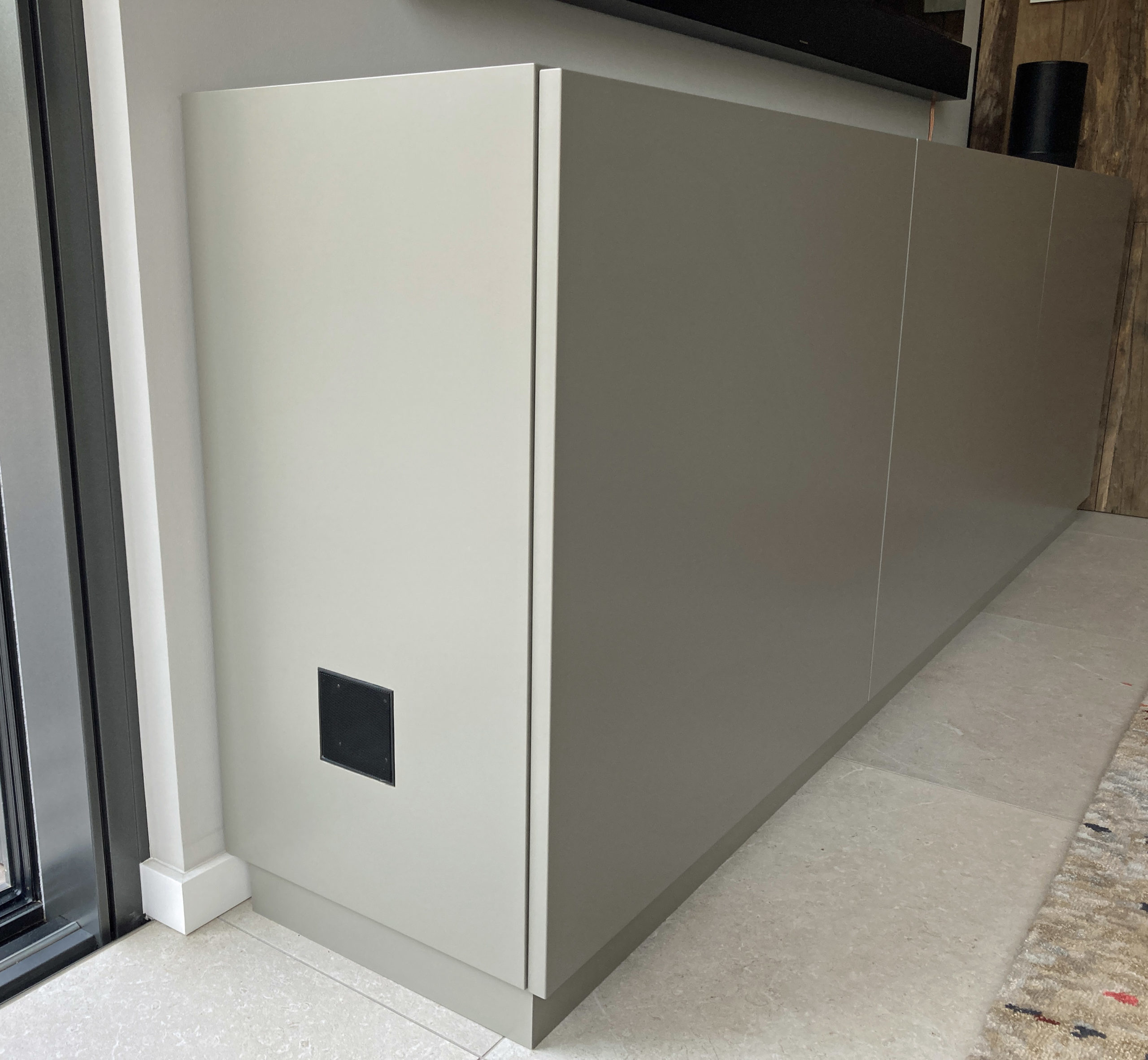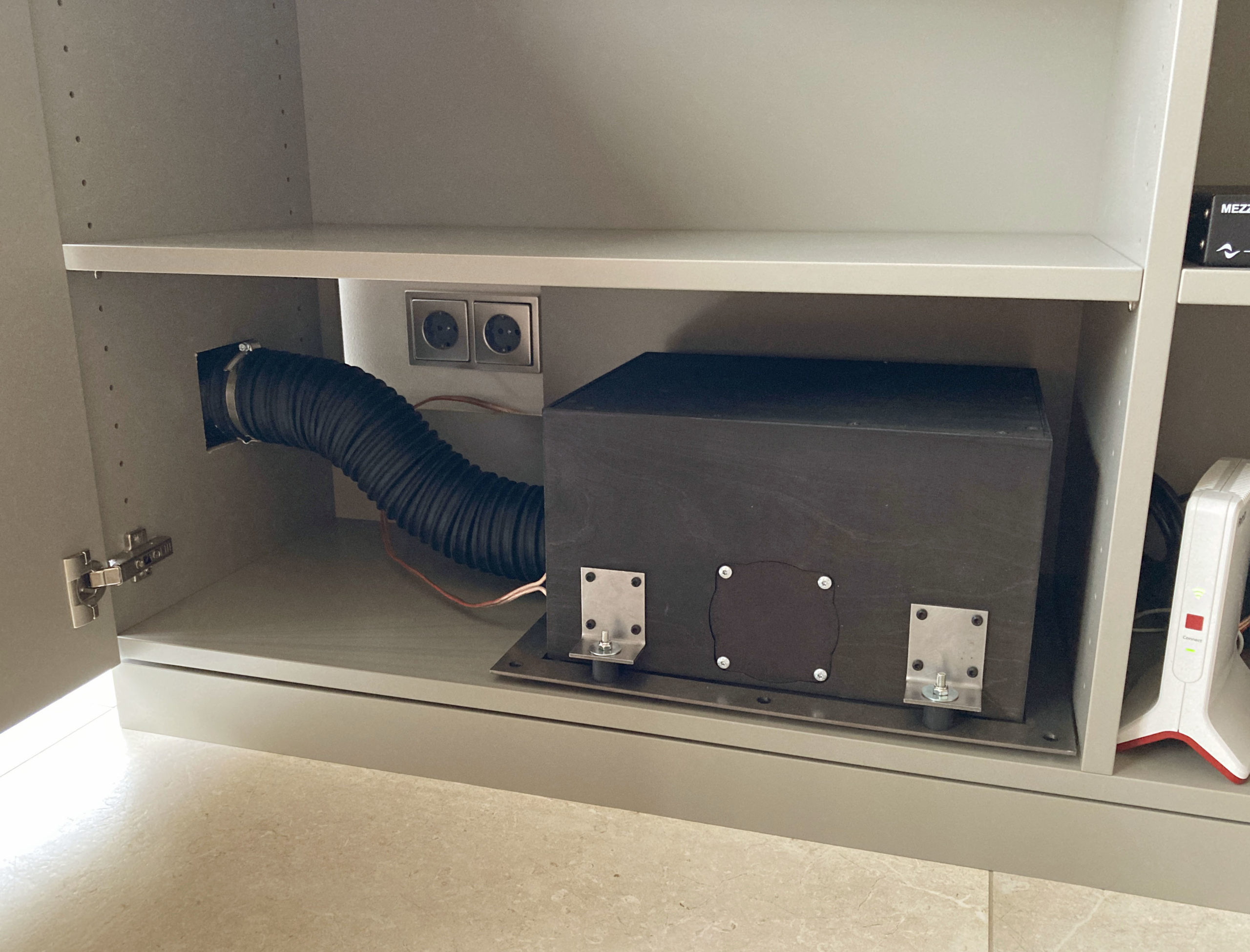 Bei diesem privaten Projekt haben wir zwei Wohnbereiche mit bestem Klang ausgestattet. Unsere Lösung für TV-Ton und Musikbeschallung im Wohnzimmer ist eine auf Maß gefertigte Soundbar vom italienischen Hersteller Garvan. Das Gehäusematerial ist lackierter Edelstahl und die Hoch- und Mitteltöner spielen gut aufgelöst und präzise. Für den Tiefton kommt ein passiver Subwoofer von Cerasonar zum Einsatz. Wir haben ihn in das vorhandene Möbel integriert. Der Schallauslass mit quadratischem Gitter ist nur 9 Zentimeter groß und an der Seite des Korpus sehr unauffällig.