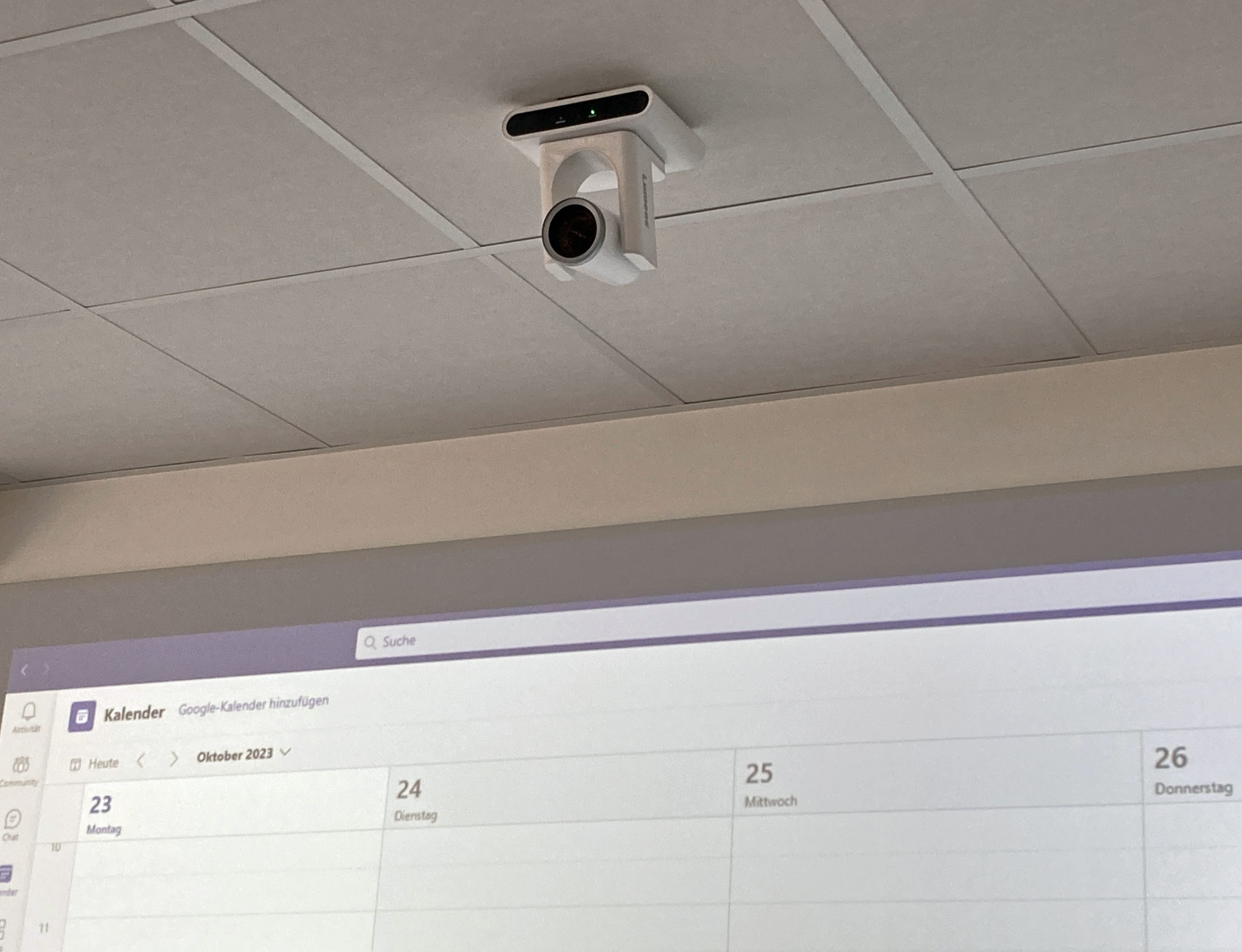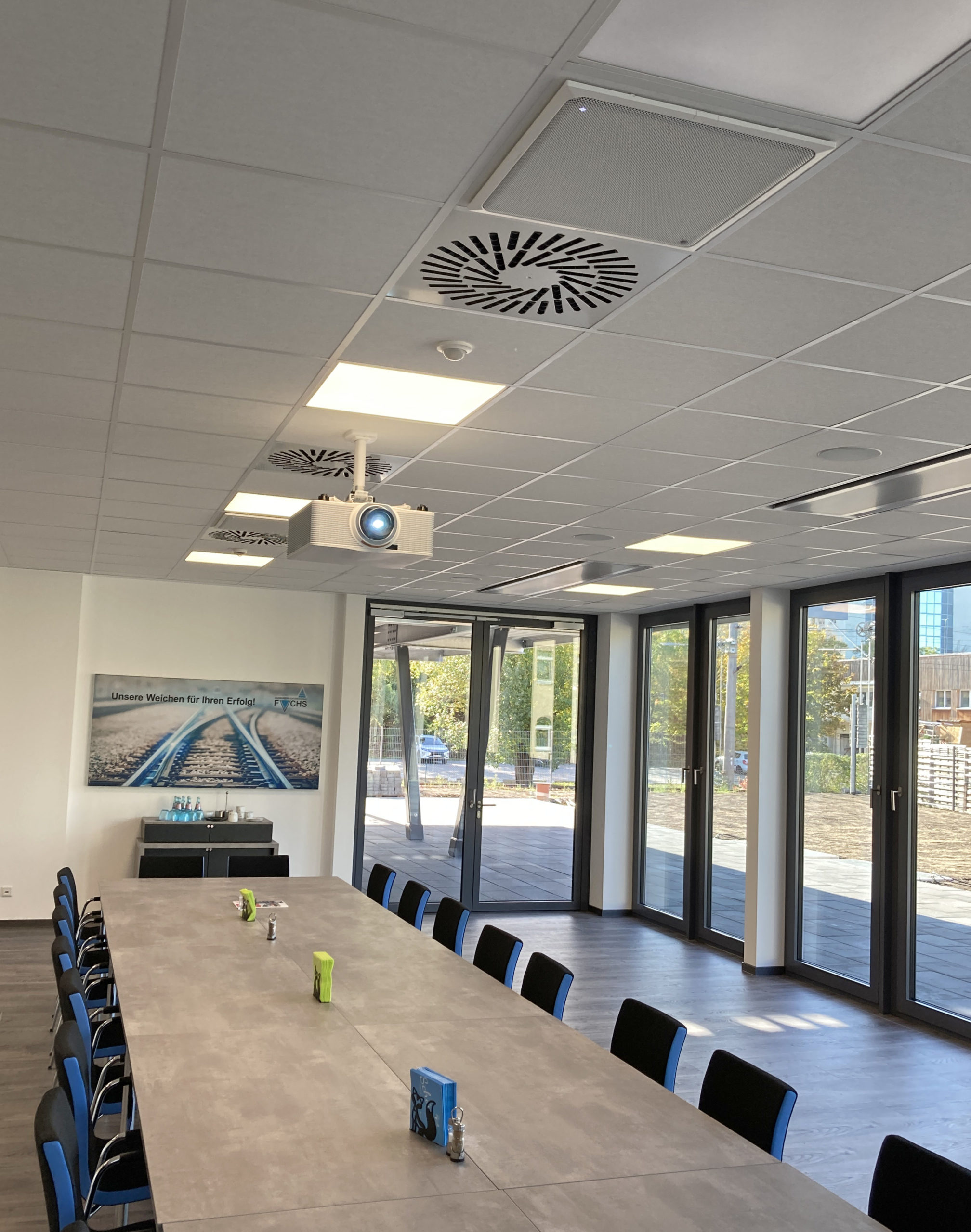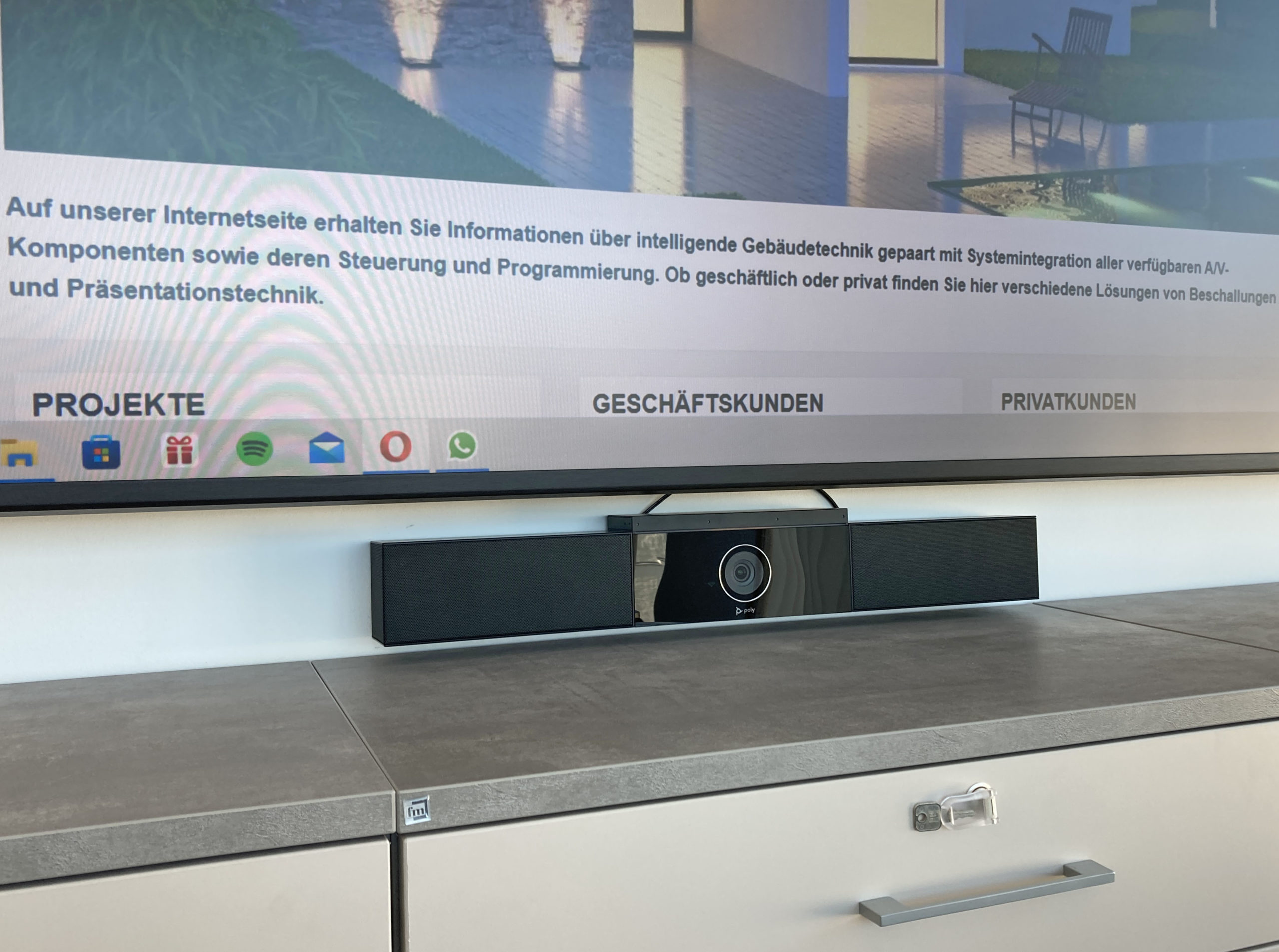 Dabei stand im Vordergrund, dass der große Beratungsraum vielseitig genutzt werden sollte: regelmäßige Meetings vor Ort, Audio-/ Videokonferenzen mit Kunden, Partnern und den Niederlassungen, sowie Feierlichkeiten und Präsentationen. Wir haben deshalb 2 spezielle quadratische Mikrofon-Arrays in die Decke installiert, welche intelligent den Sprecher orten und verstärken. Die vollbewegliche Kamera ist ebenfalls automatisiert und erfasst sekundenschnell den Redner. Alle Signale werden in die Konferenz-Software eingespeist. Gleichzeitig können die Präsentierenden ihre Dokumente vom Laptop kabellos per ClickShare zum Projektor und zur Audioanlage übertragen. Im Ergebnis kann sich jeder Teilnehmer per Knopfdruck mit der kompletten Medientechnik des Raumes verbinden und das Meeting kann beginnen.