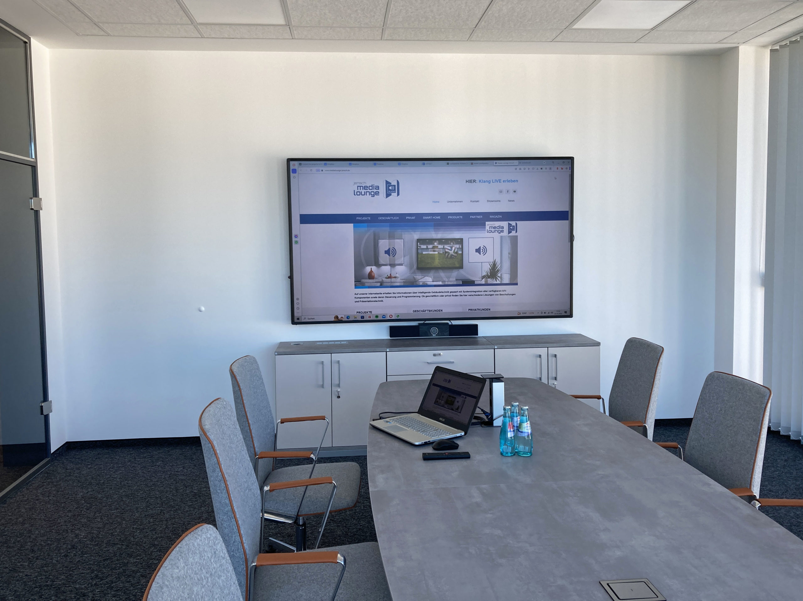 Auch im kleinen Beratungsraum findet sich einfach bedienbare Medientechnik: Eine All-In-One Videobar unter dem Display erfasst Ton und Bild des Sprechers vollautomatisch und gibt Musik und Sprache über die integrierten Lautsprecher aus. Telefonanrufe sind damit genauso möglich wie Audio-/Videokonferenzen und Beratungen, in denen Inhalte in hoher Qualität betrachtet werden sollen.