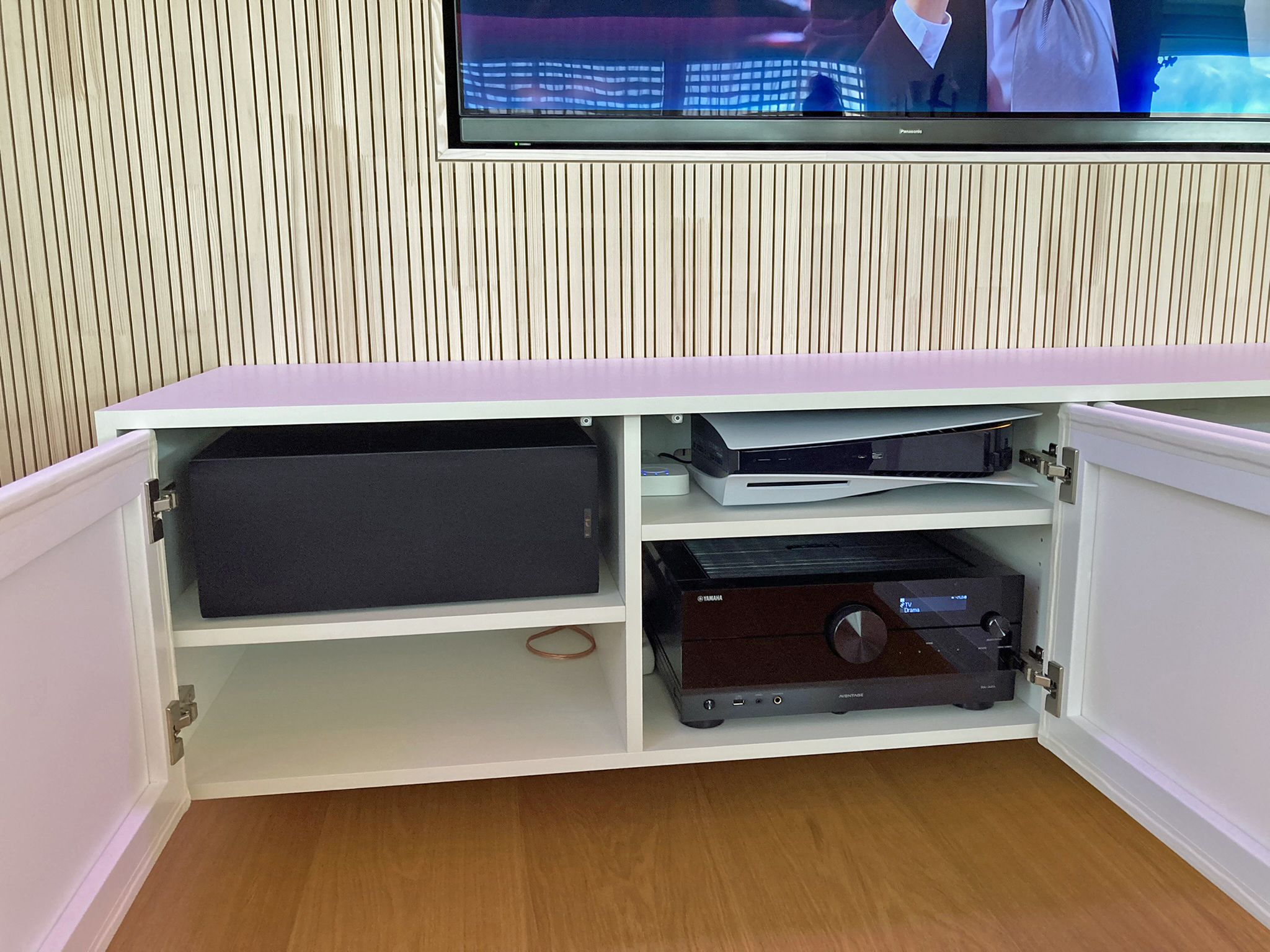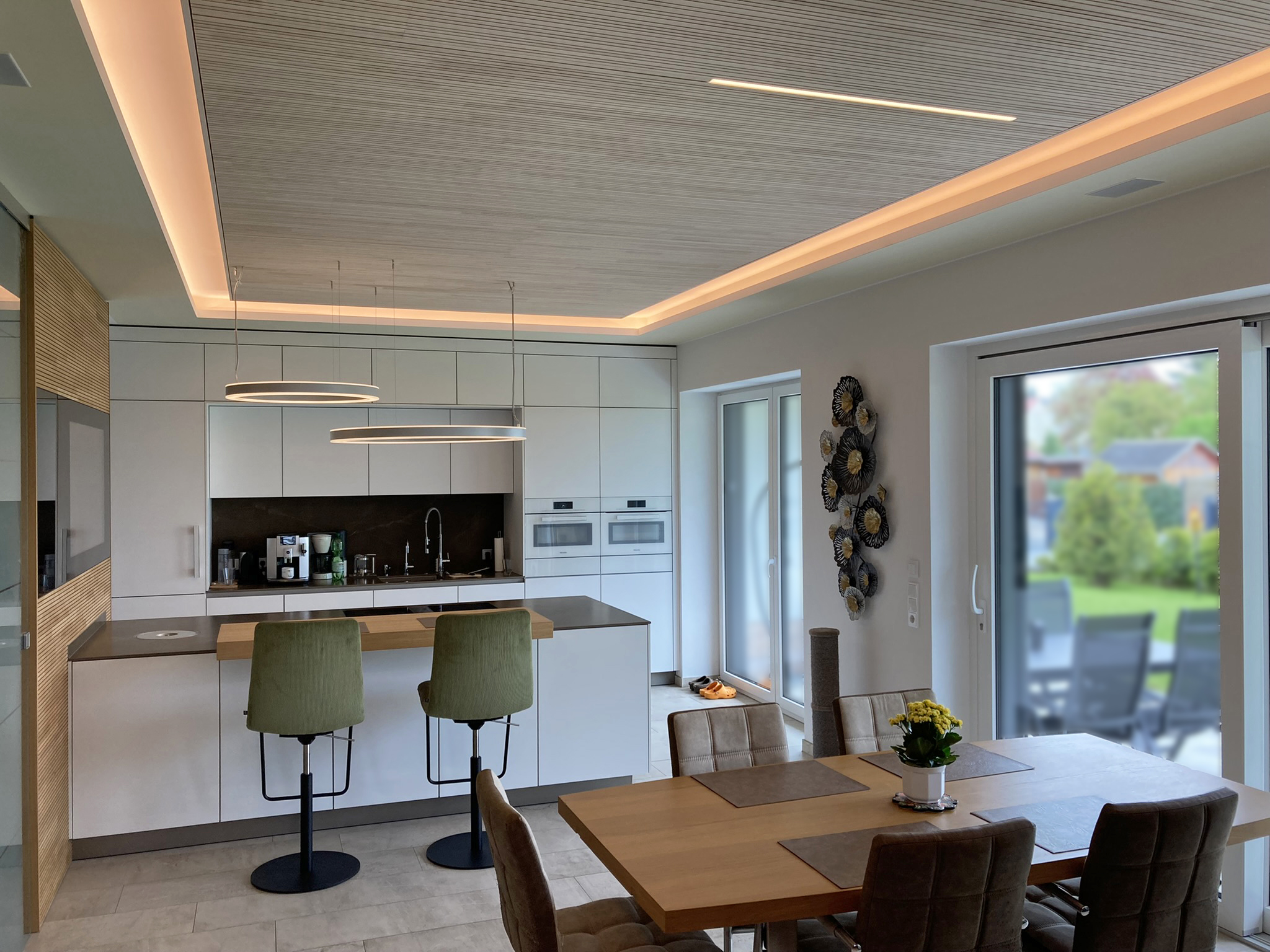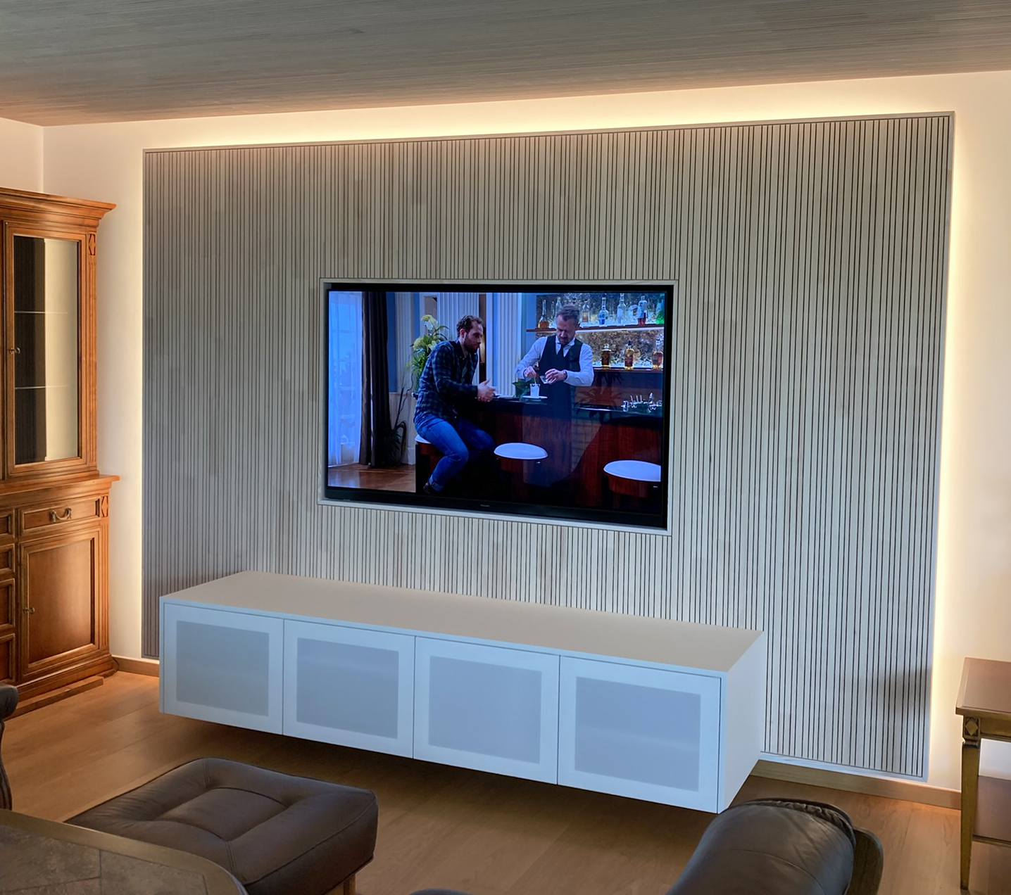 Unser Kunde wünschte eine deutliche Verbesserung des Klangs, vor allem beim Musizieren. Wir haben Ligno Holz-Akustikdecken in Weißtanne großflächig in Flur, Küche und Wohnzimmer an die Bestands-Decke montiert. Im Schlafzimmer ist Zirpe verbaut. Der Schall wird nun gedämpft und gestreut. „Harte“ Echos sind nicht mehr zu hören. Die neue Decken-Ebene nutzen wir gleichzeitig für eine indirekte Beleuchtung mit veränderbarer Lichtfarbe und Helligkeit. Selbst Lautsprecher können elegant ins Ligno eingebaut werden, wir haben die Surround-Lautsprecher auf diese Art montiert. Front-Lautsprecher, Subwoofer und sämtliche technische Komponenten platzierten wir im Lowboard. Der Ton der Lautsprecher dringt durch den weißen Akustikstoff zur Hörposition. Im Ergebnis ein beeindruckender Klang beim Filme schauen und genauso beim Musizieren. Wir haben uns mit unserer Kundin gefreut, als die ersten Töne auf dem Flügel angespielt wurden – angenehm klar und detailgetreu!