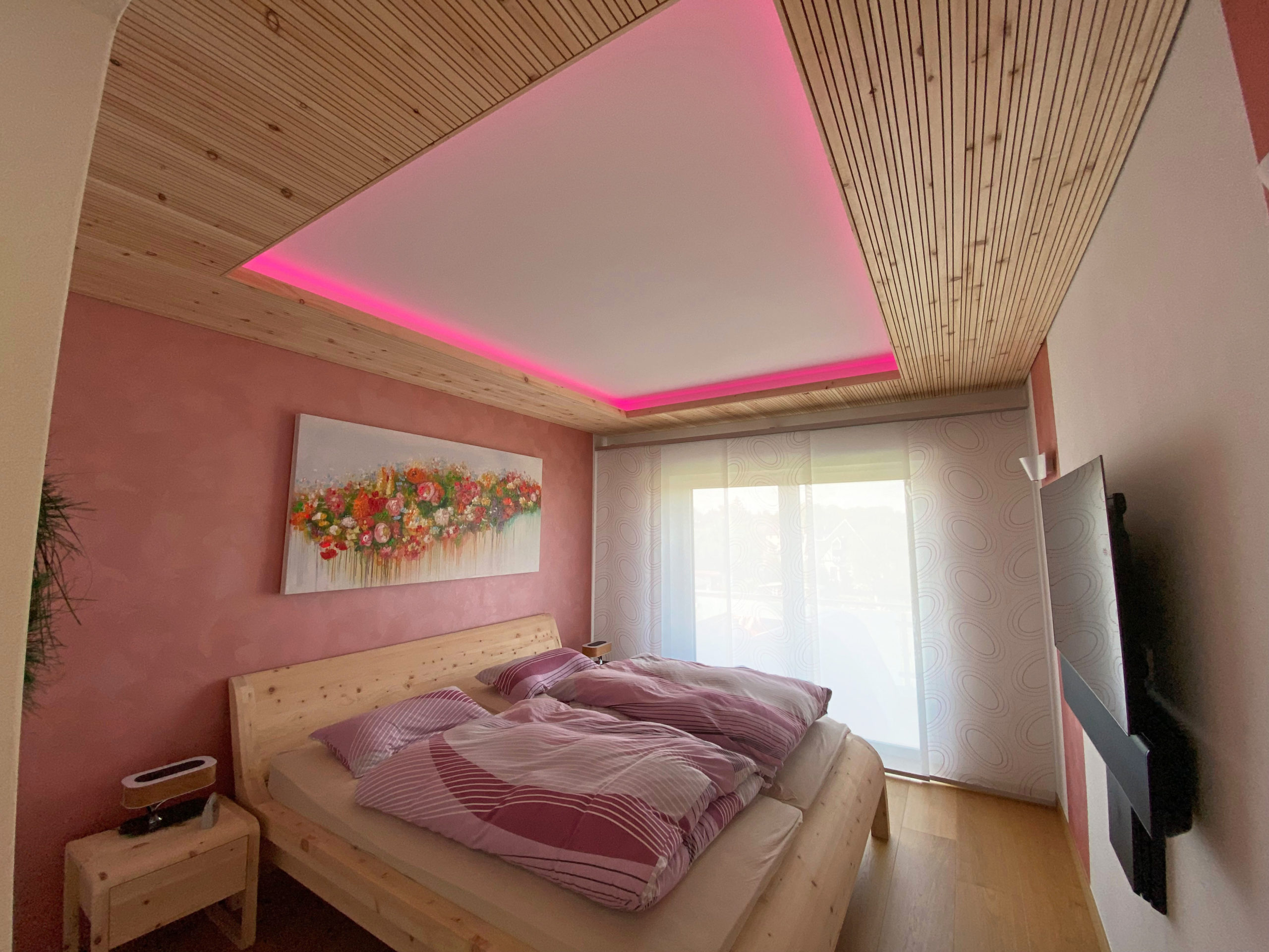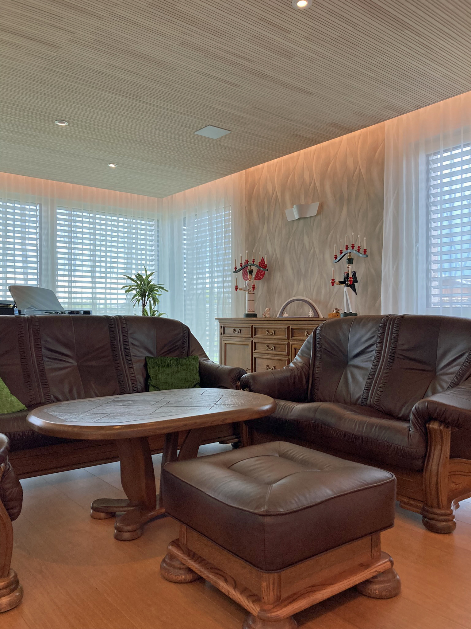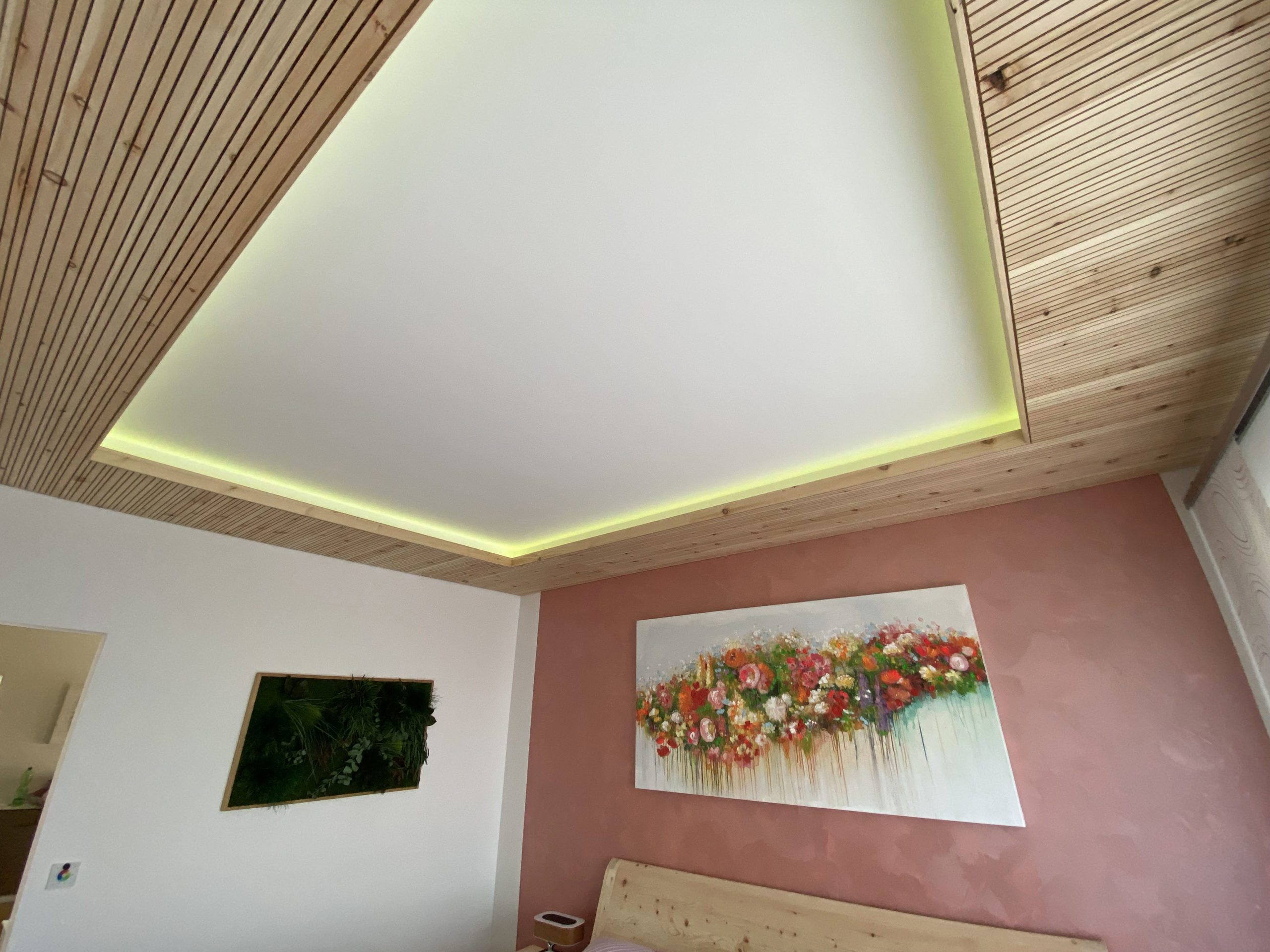 Unser Kunde wünschte eine deutliche Verbesserung des Klangs, vor allem beim Musizieren. Wir haben Ligno Holz-Akustikdecken in Weißtanne großflächig in Flur, Küche und Wohnzimmer an die Bestands-Decke montiert. Im Schlafzimmer ist Zirpe verbaut. Der Schall wird nun gedämpft und gestreut. „Harte“ Echos sind nicht mehr zu hören. Die neue Decken-Ebene nutzen wir gleichzeitig für eine indirekte Beleuchtung mit veränderbarer Lichtfarbe und Helligkeit. Selbst Lautsprecher können elegant ins Ligno eingebaut werden, wir haben die Surround-Lautsprecher auf diese Art montiert. Front-Lautsprecher, Subwoofer und sämtliche technische Komponenten platzierten wir im Lowboard. Der Ton der Lautsprecher dringt durch den weißen Akustikstoff zur Hörposition. Im Ergebnis ein beeindruckender Klang beim Filme schauen und genauso beim Musizieren. Wir haben uns mit unserer Kundin gefreut, als die ersten Töne auf dem Flügel angespielt wurden – angenehm klar und detailgetreu!