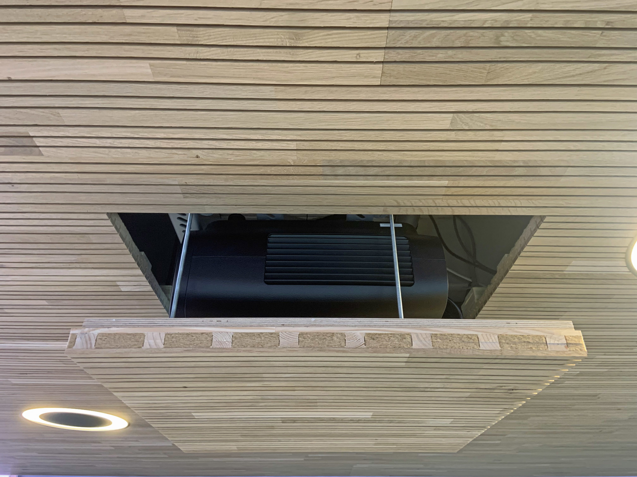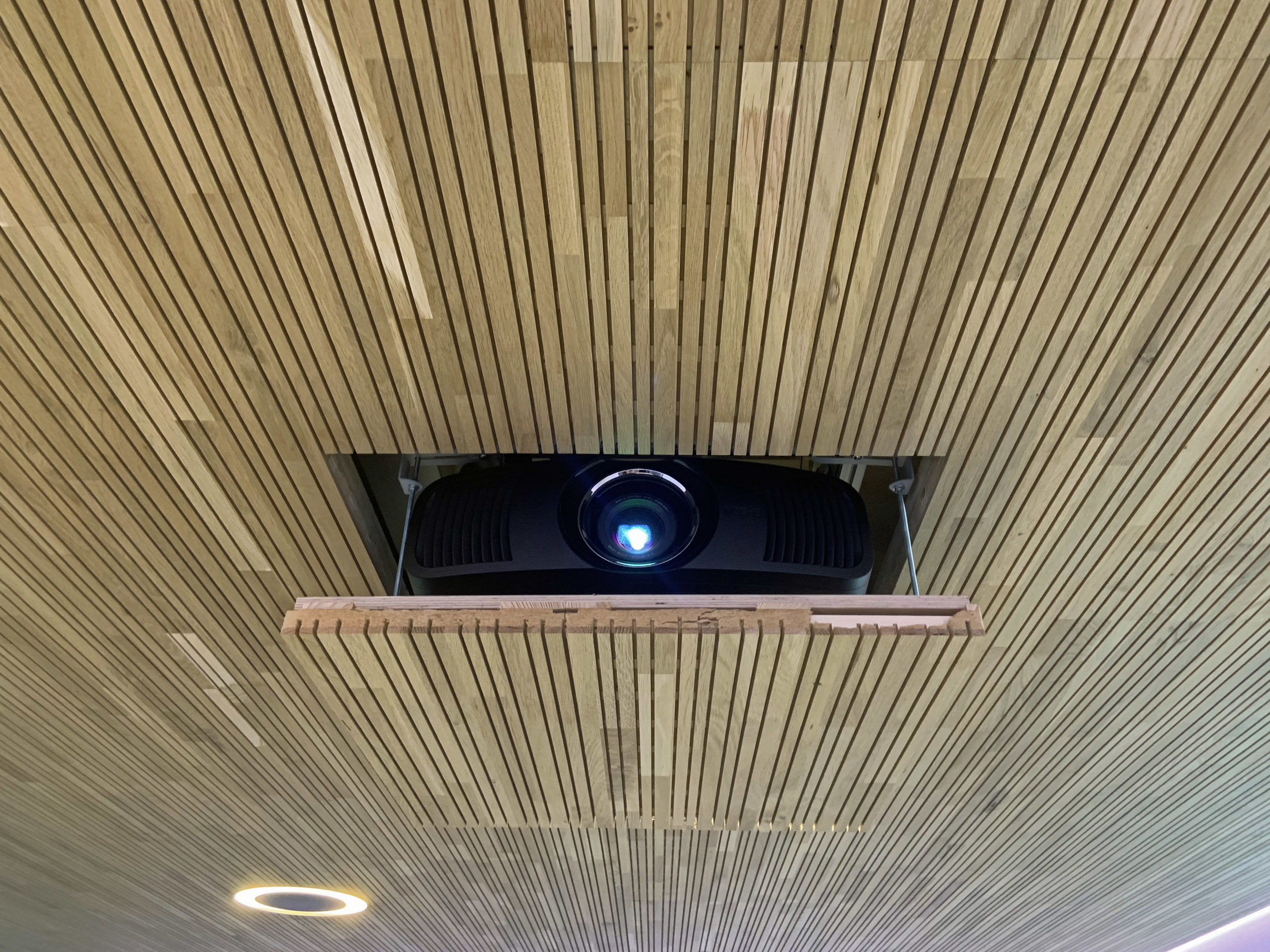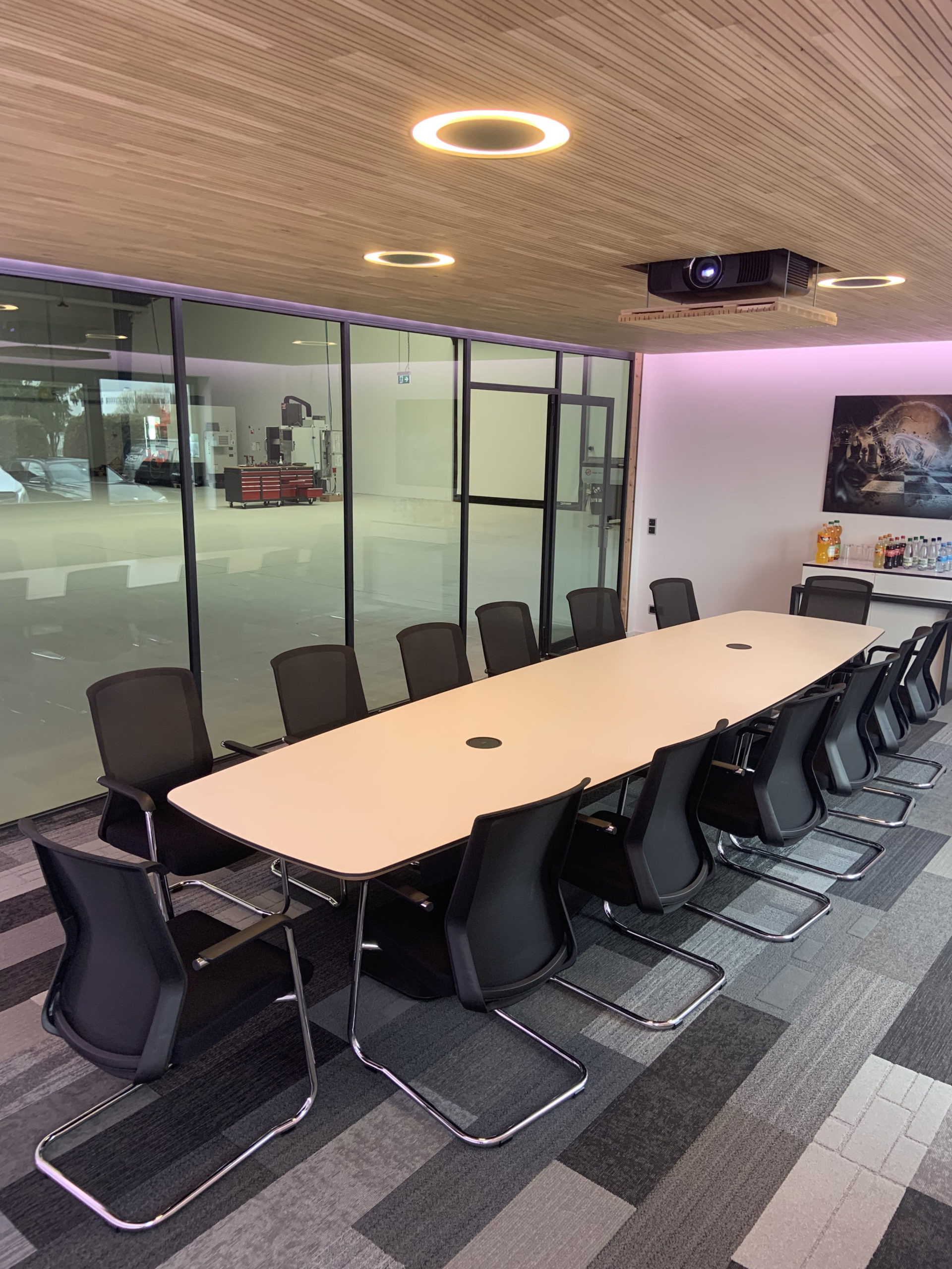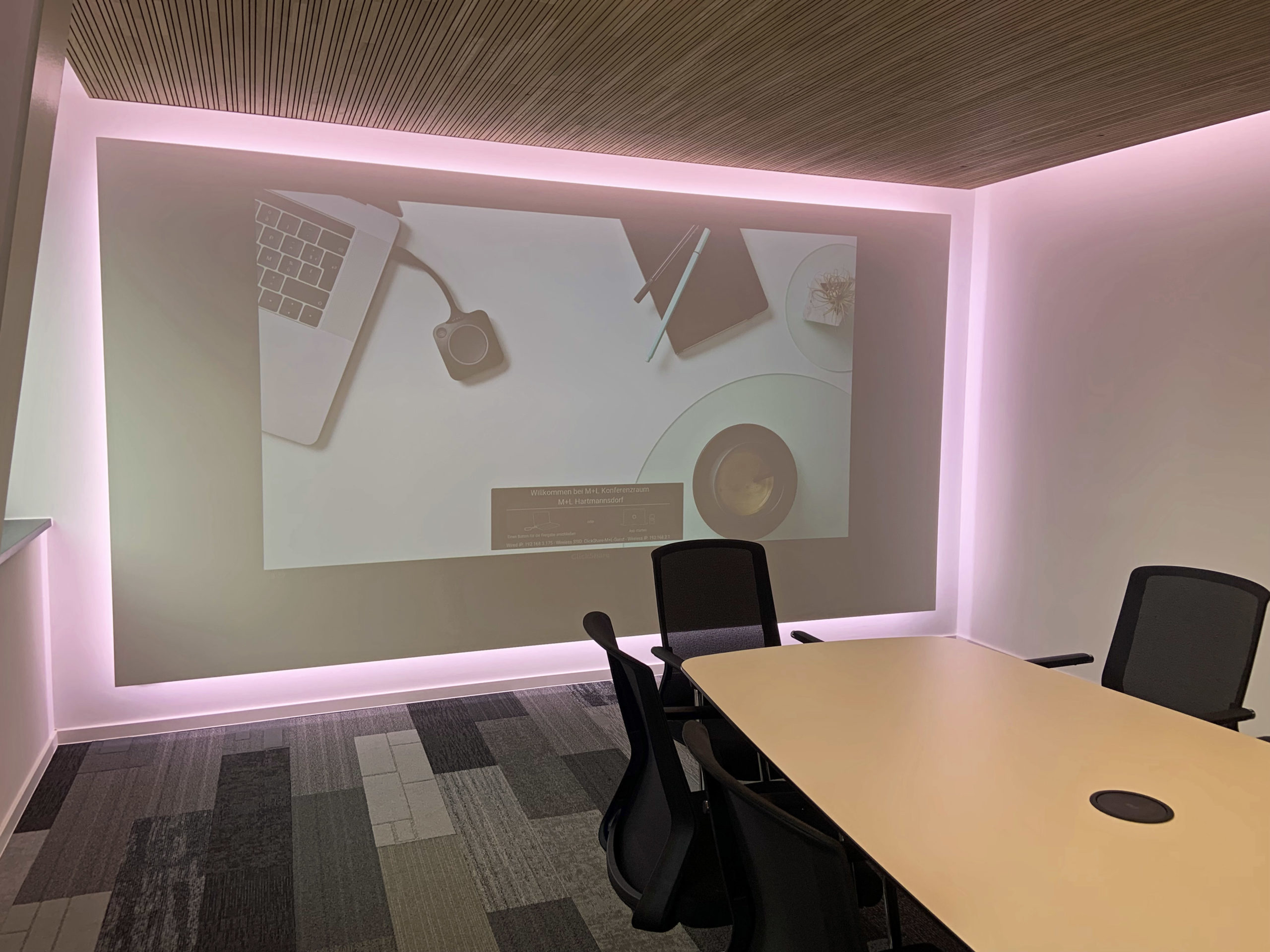 Ein Wandsegel fungiert als Leinwand mit abgesetzten Formteilen und vierseitiger LED Ambiente-Beleuchtung dimmbar. Zusätzliche runde Design LED-Deckenleuchten ermöglichen eine helle Ausleuchtung auf dem Konferenztisch. Im integrierten Deckenlift parkt ein 4K-Beamer, eine Audioanlage mit drei unsichtbaren Lautsprechern in der Projektionsfläche und zwei nicht sichtbare Surround-Lautsprecher in der Akustikdecke lassen im Hörbereich keine Wünsche offen. Die Medienhardware (Verstärker, Zuspieler) wurde im Technikraum ausgelagert und sorgt somit für Sicherheit.