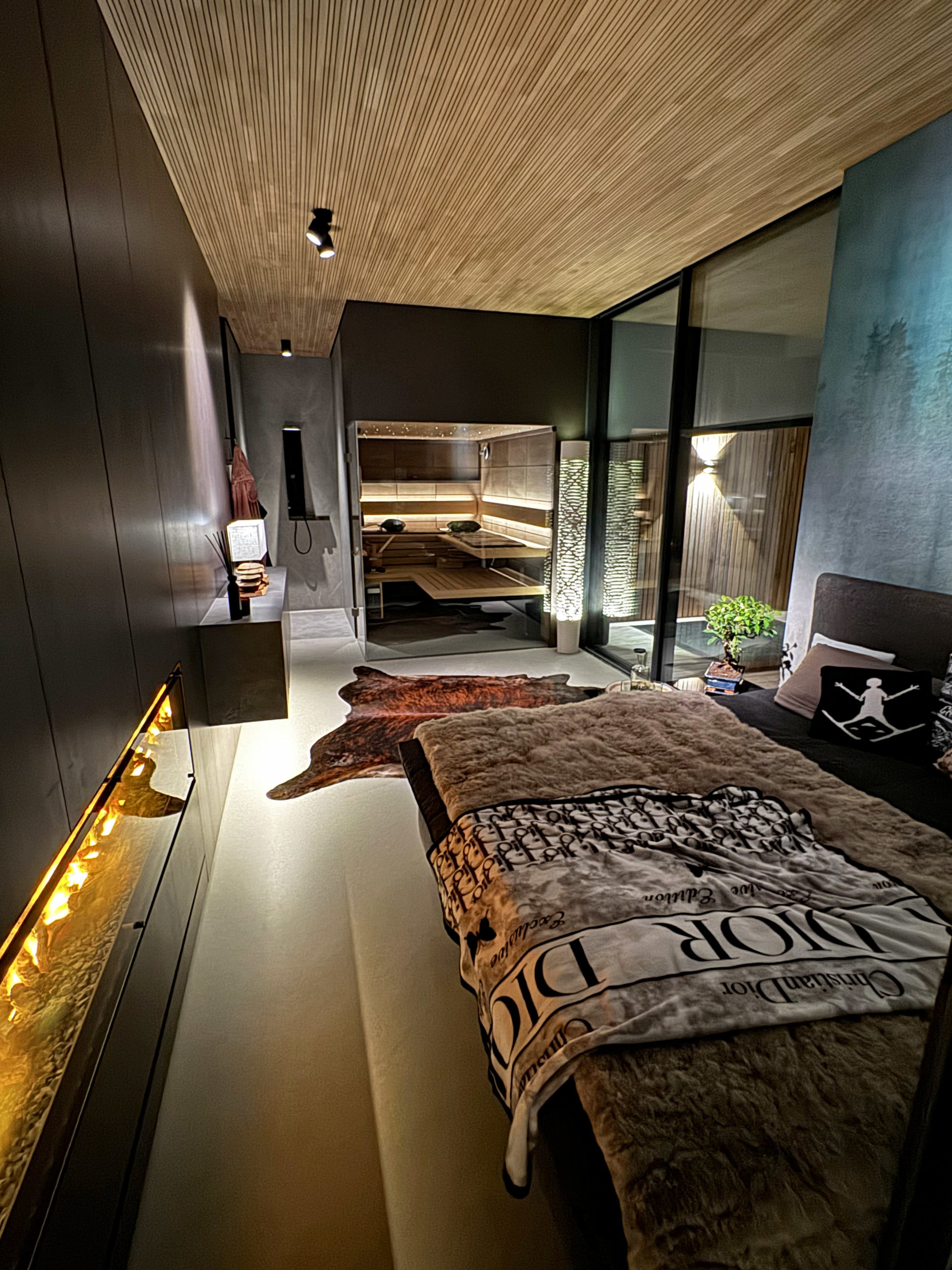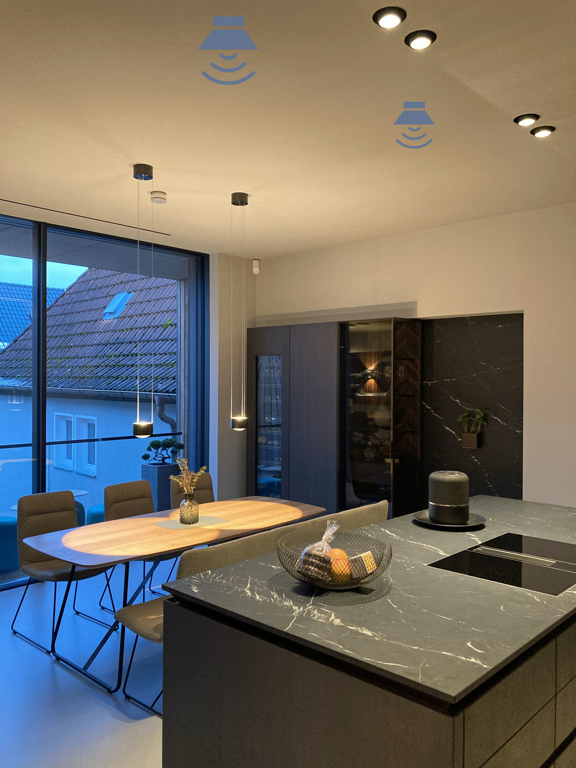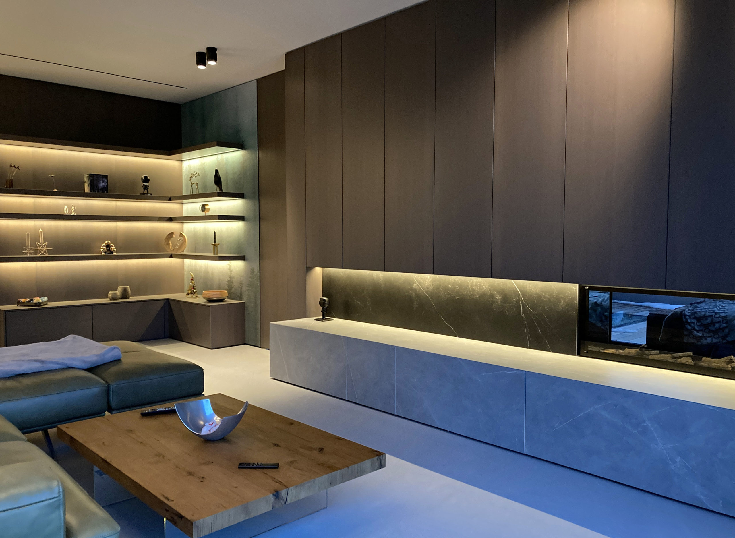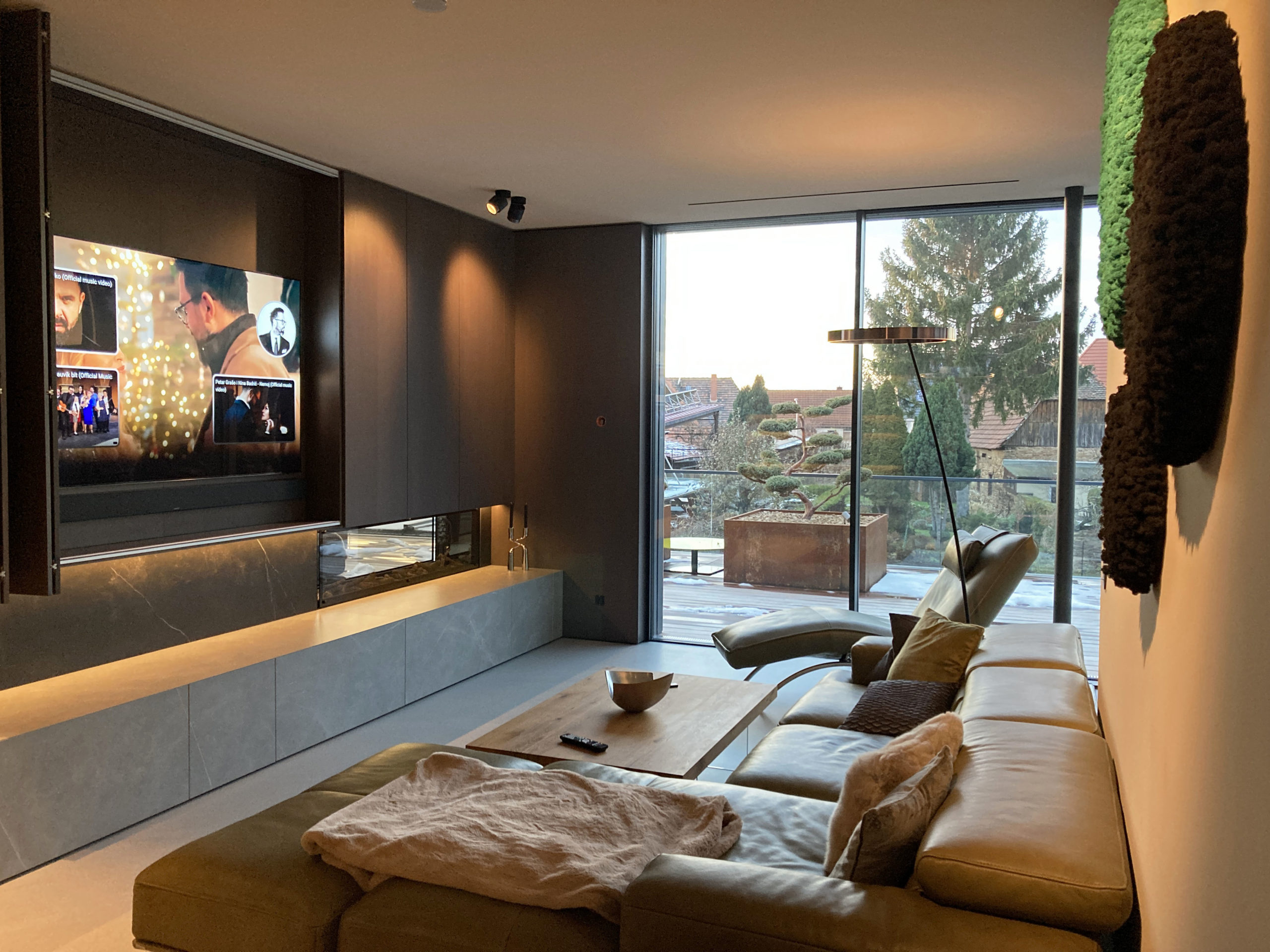 Dann kommen Wände, Decken und die bewussten Design-Elemente völlig ungestört zur Geltung – wohnlich und gleichzeitig edel. Wir haben in allen Räumen unsichtbare Flächenlautsprecher paarweise in den Decken verbaut. Im Wohnzimmer wird damit der Surround-Sound erzeugt. Die Wohnwand wird für’s Filme schauen geöffnet und dann sorgen dort eine erstklassige Soundbar und ein versteckt eingebauter Subwoofer für Kino-Feeling. Einen Kontrast bietet der Wellness-Bereich: die Ligno-Holzdecke schafft optimale Raumakustik und Natürlichkeit. Lautsprecher sind auch hier unsichtbar integriert. Zum Multi-Room Audio gehört bei diesem Projekt auch der Außenbereich mit Schwimmpool, Sonnenterrasse und Außenküche. Die Musik wird von Design-Lautsprechern vom italienischen Hersteller Garvan wiedergegeben. Damit sind auch Party-taugliche Lautstärke und kraftvolle Bässe möglich!