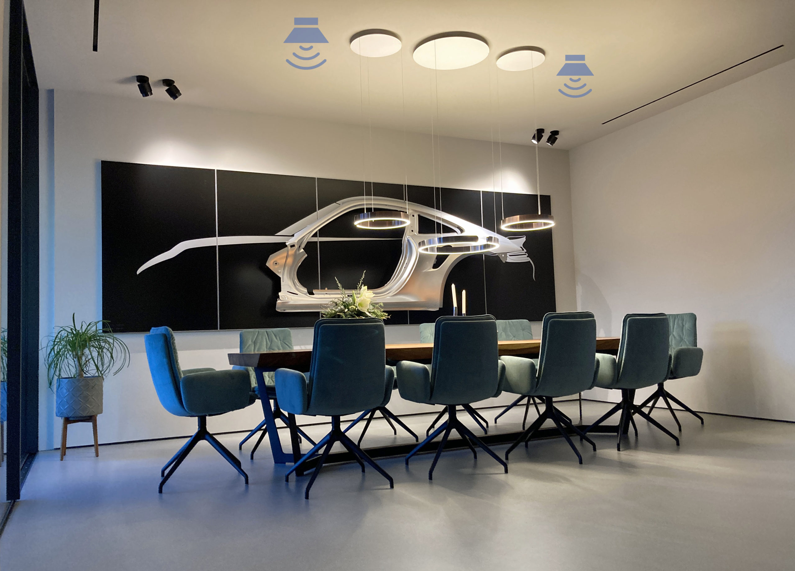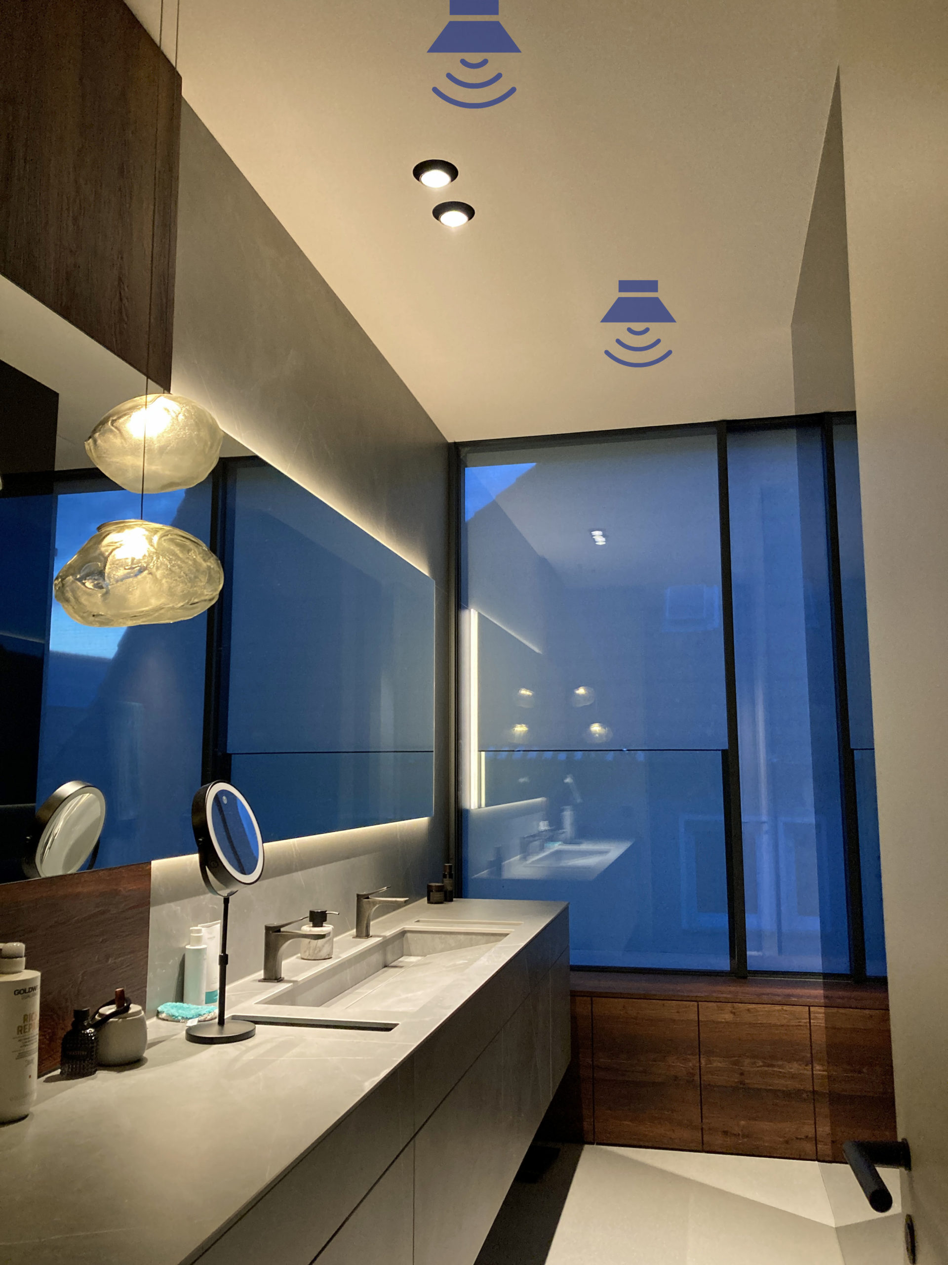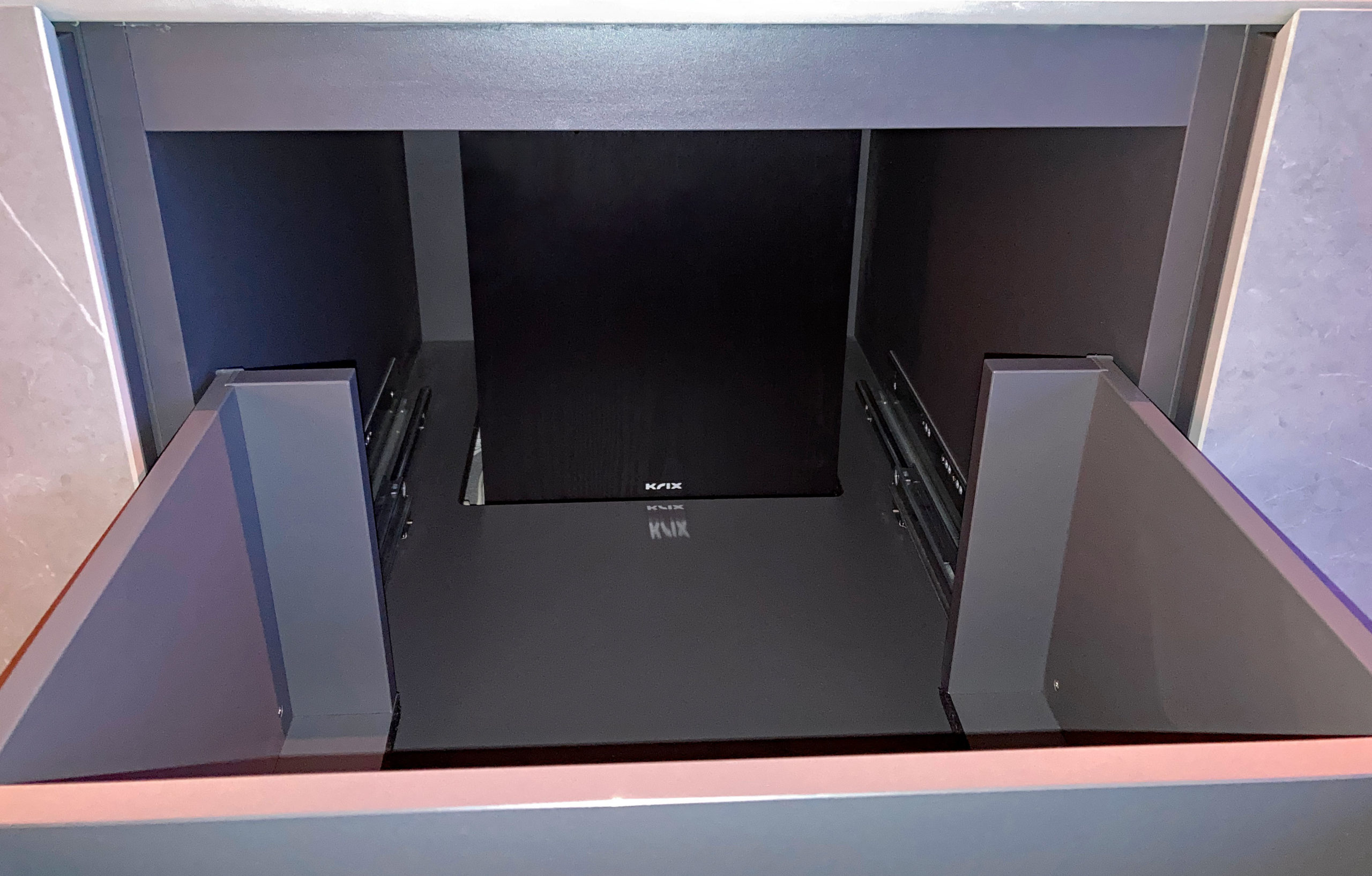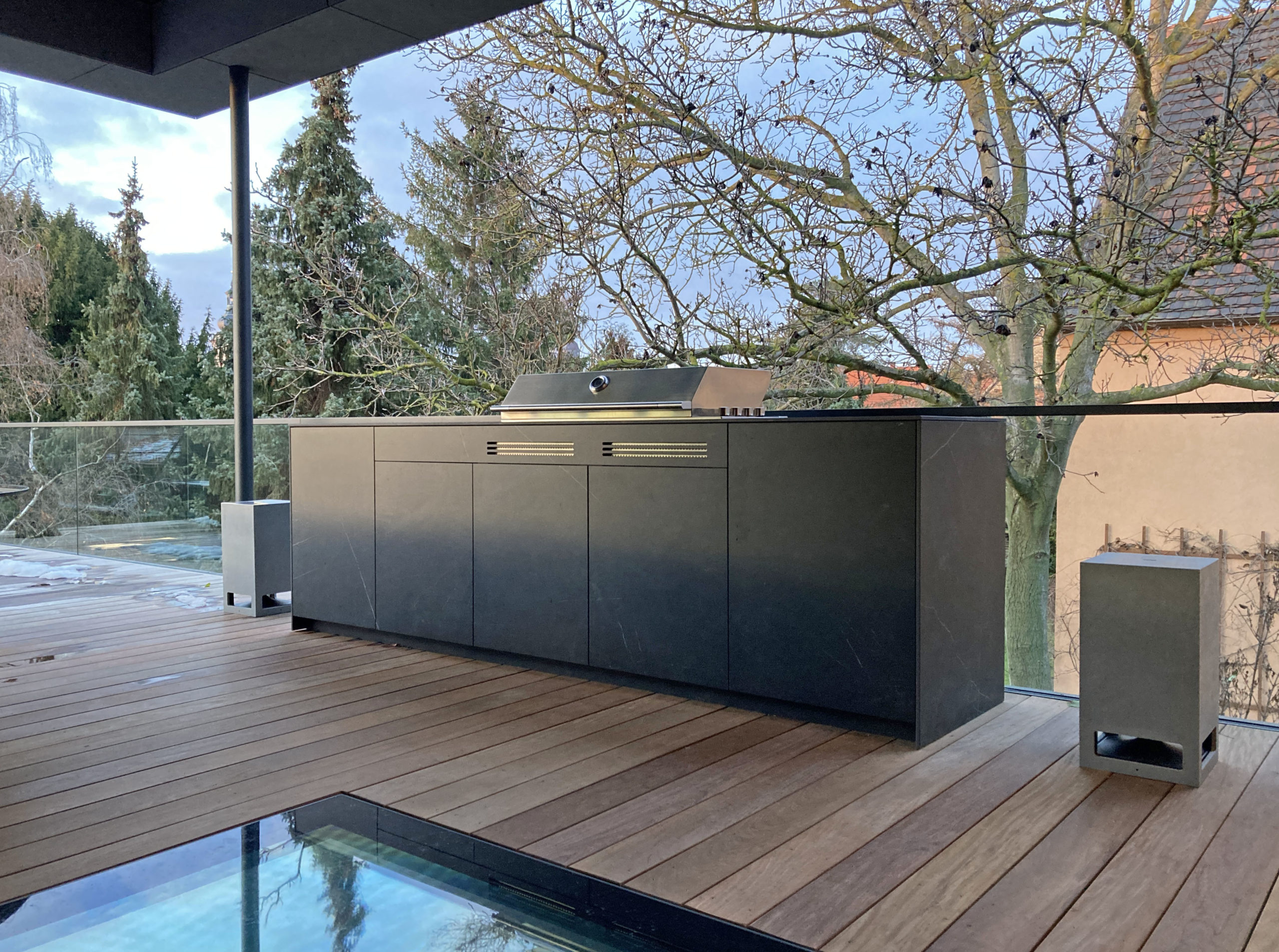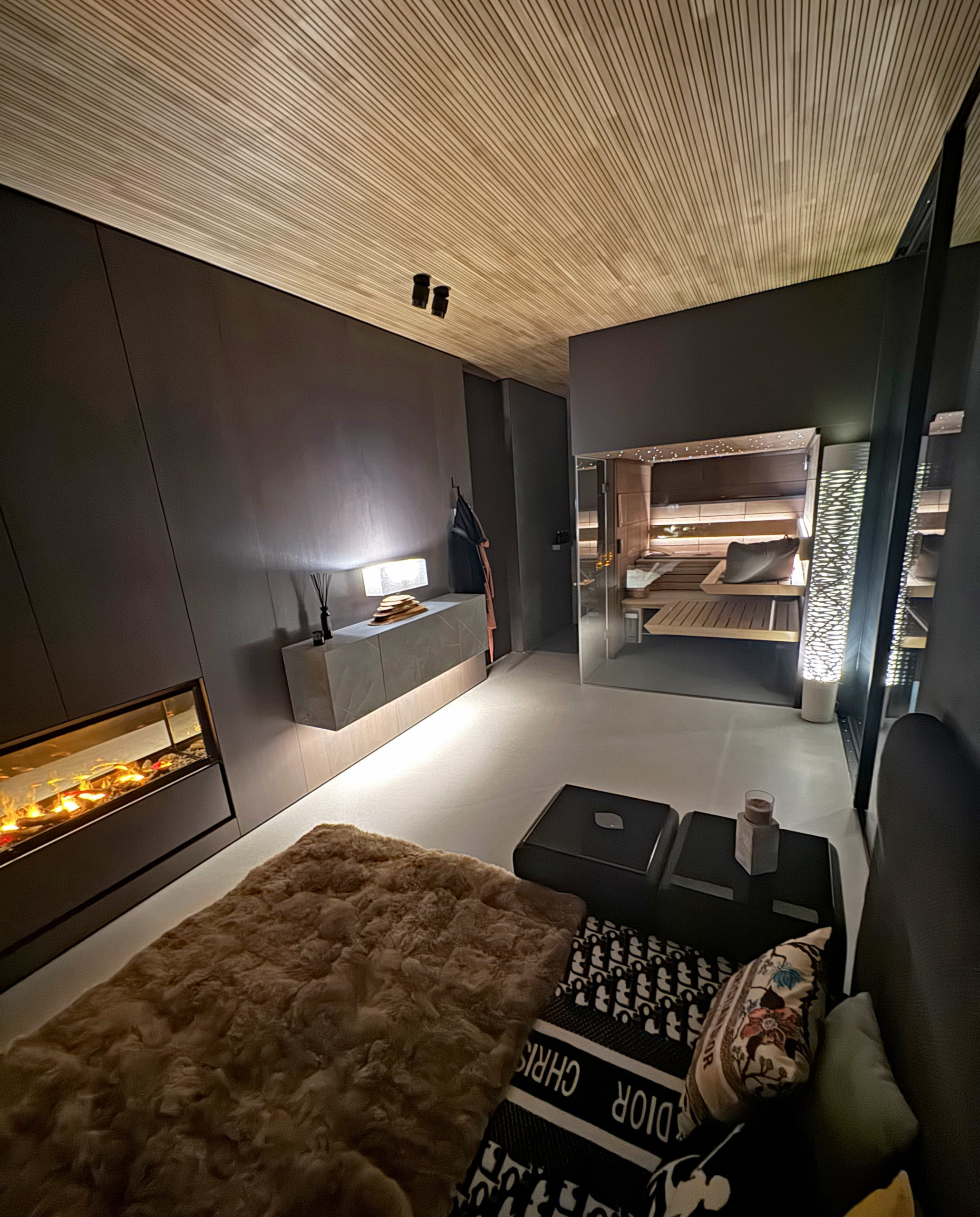 Dann kommen Wände, Decken und die bewussten Design-Elemente völlig ungestört zur Geltung – wohnlich und gleichzeitig edel. Wir haben in allen Räumen unsichtbare Flächenlautsprecher paarweise in den Decken verbaut. Im Wohnzimmer wird damit der Surround-Sound erzeugt. Die Wohnwand wird für’s Filme schauen geöffnet und dann sorgen dort eine erstklassige Soundbar und ein versteckt eingebauter Subwoofer für Kino-Feeling. Einen Kontrast bietet der Wellness-Bereich: die Ligno-Holzdecke schafft optimale Raumakustik und Natürlichkeit. Lautsprecher sind auch hier unsichtbar integriert. Zum Multi-Room Audio gehört bei diesem Projekt auch der Außenbereich mit Schwimmpool, Sonnenterrasse und Außenküche. Die Musik wird von Design-Lautsprechern vom italienischen Hersteller Garvan wiedergegeben. Damit sind auch Party-taugliche Lautstärke und kraftvolle Bässe möglich!