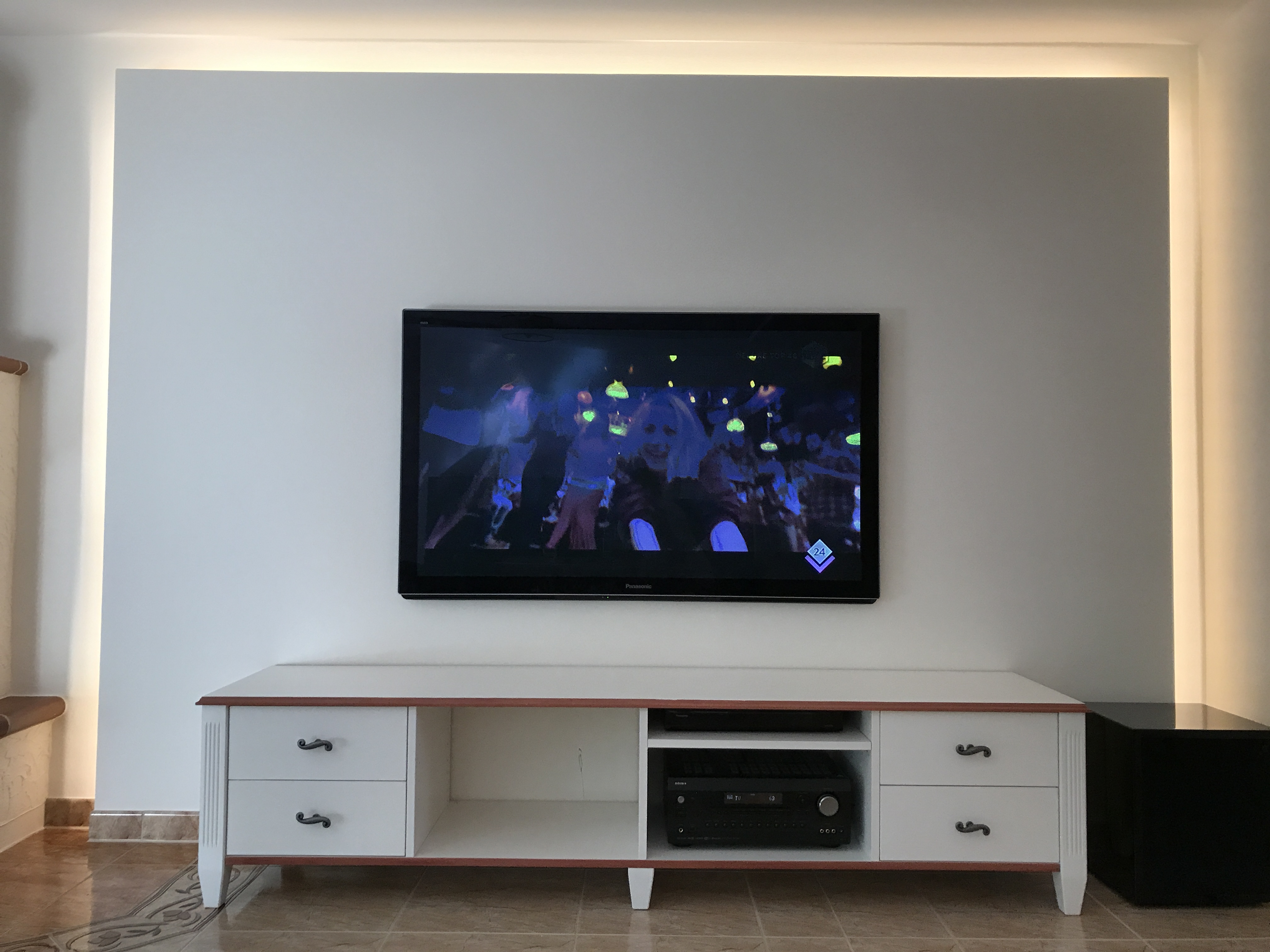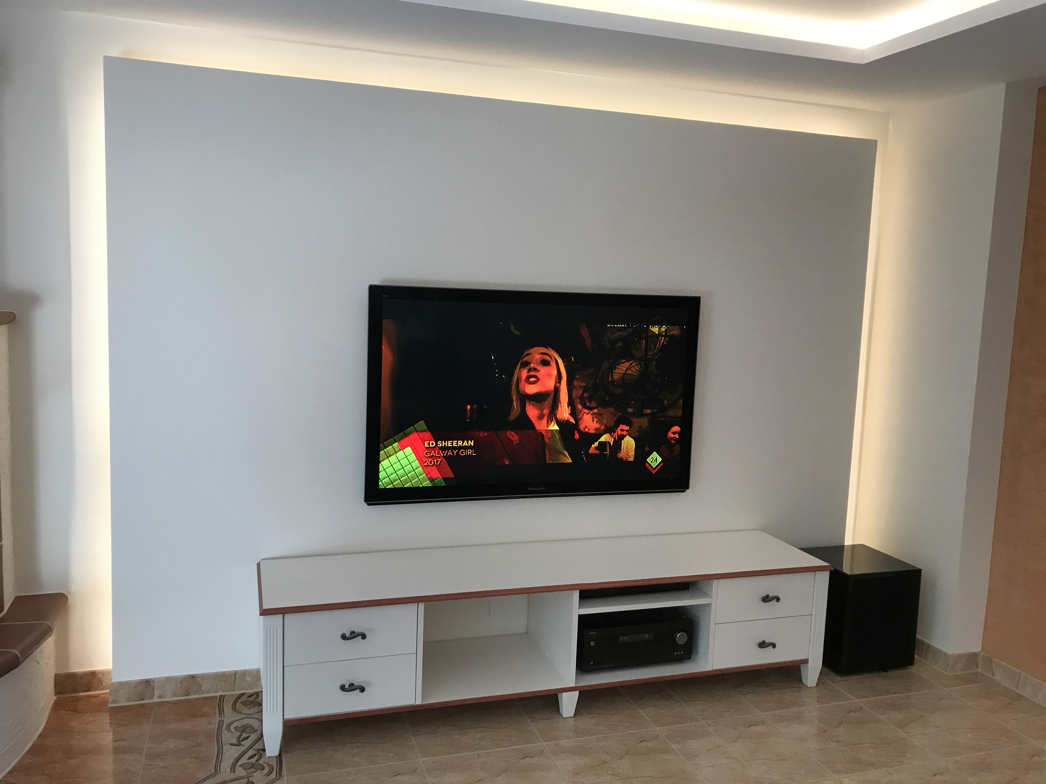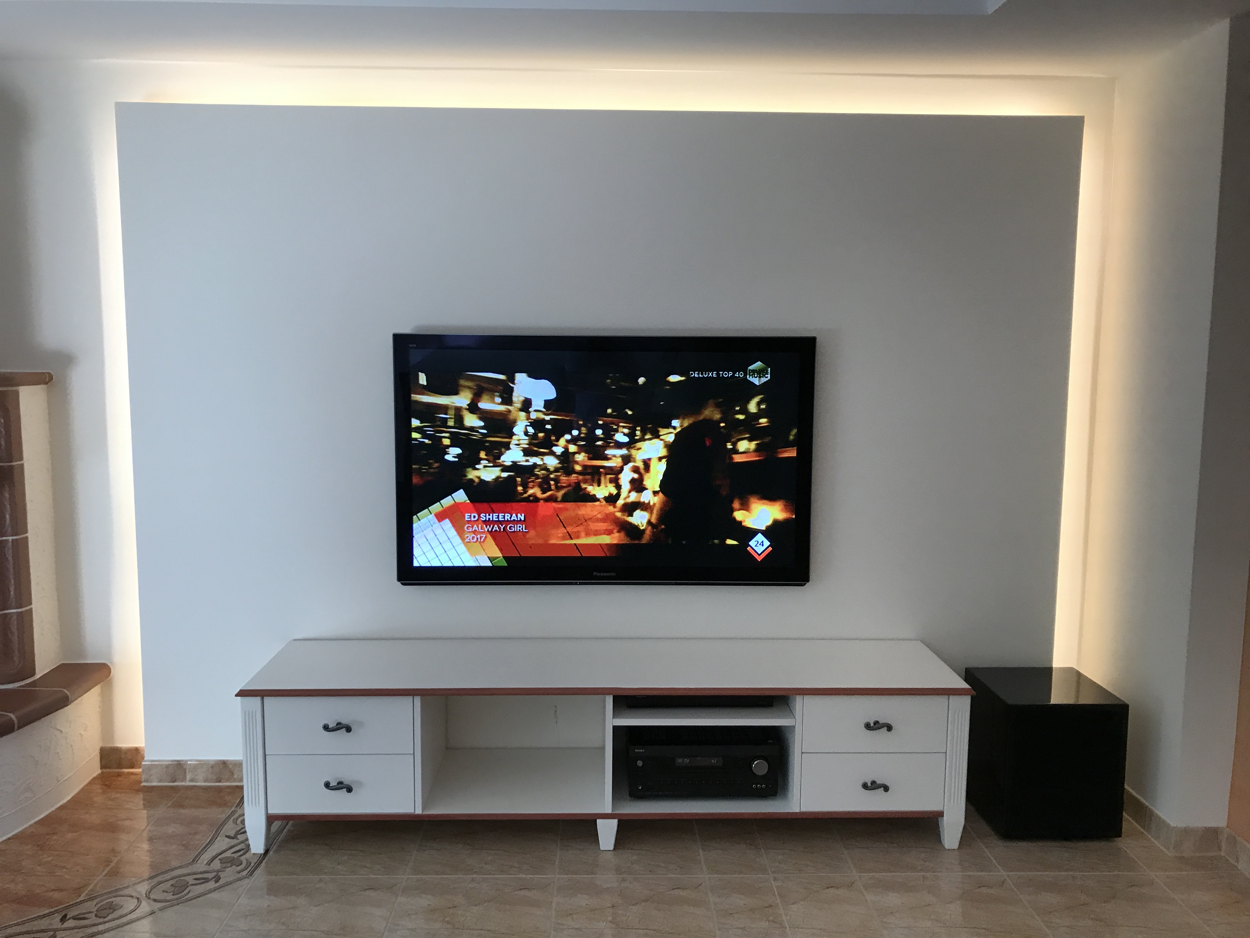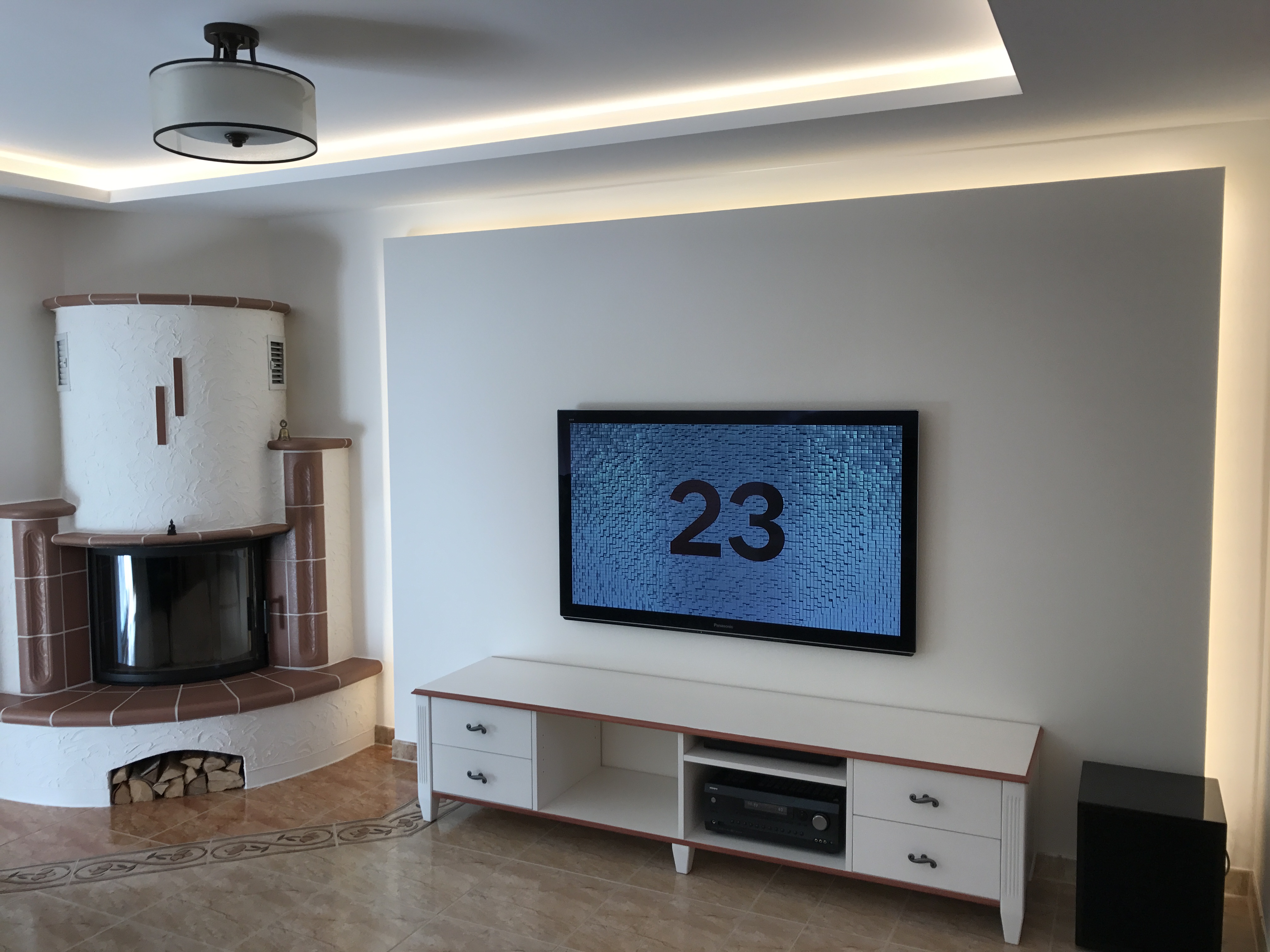 Bei diesem Projekt wurde ein Wandsegel sowie Lichtvouten im Deckenbereich mit unsichtbaren Lautsprechern von Stealth Acoustic montiert. Der 60“ Panasonic TV wird von einer TV-Halterung von Chief komplettiert. Der freistehende Subwoofer von Sonance sorgt für die notwendige Tieffrequenz. Ein AV-Receiver von Integra lässt keine Wünsche hinsichtlich der Steuerung und Bedienung offen. Die LED-Beleuchtungen an Wandsegel und in der Lichtvoute Decke runden das gesamte Erscheinungsbild positiv ab.
